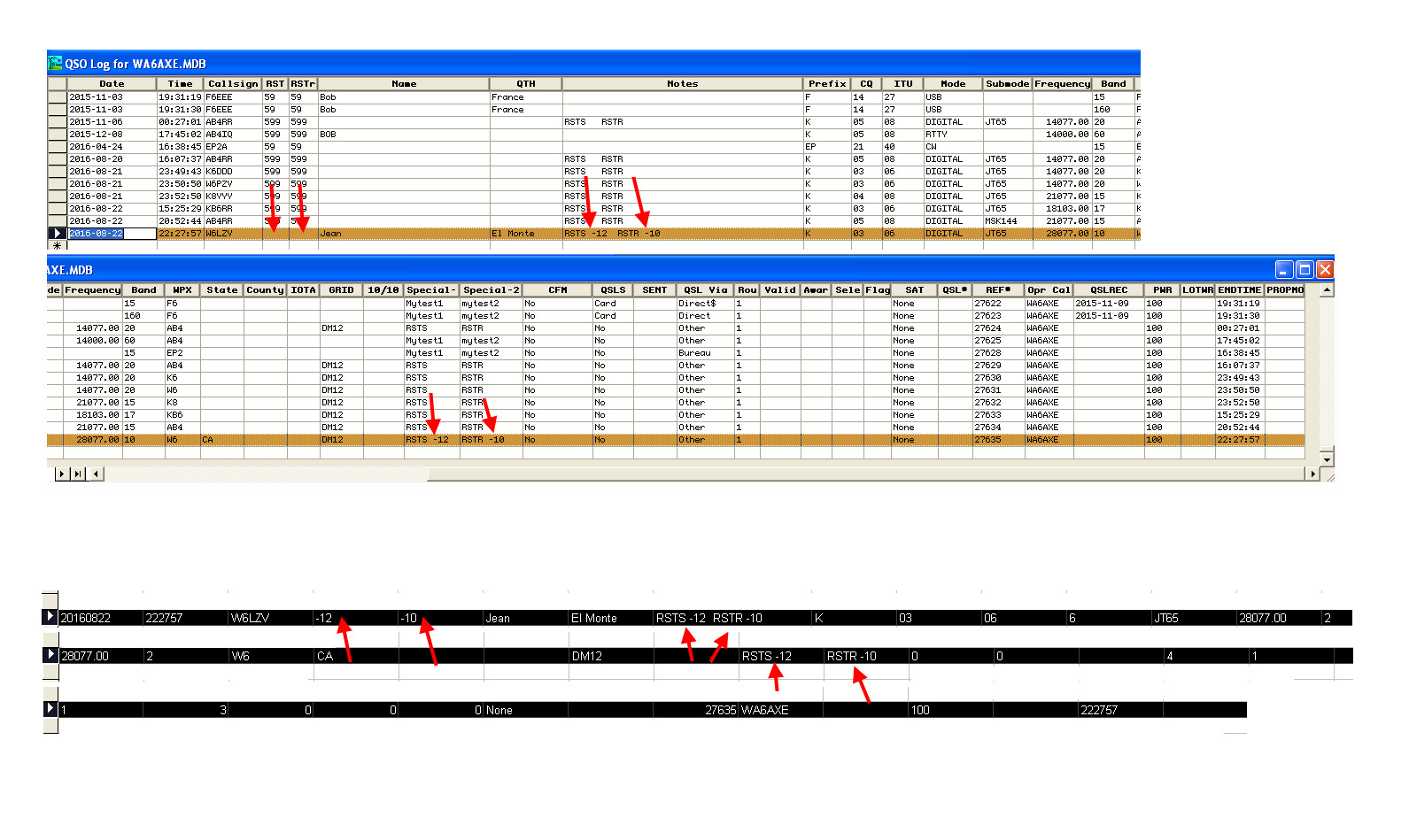 I logged a DUMMY QSO using DXbase2007 ver 1.10 / My WSJT-X ver 1.4 BRIDGE / and WSJT-X ver 1.7 program. Then I took screen-shots of both my LOG WINDOW within DXbase2007 - and - also I took that MDB logbook file into Access97 and got more screen-shots. The UPPER portion of the below listed jpg file shows my LOG Window -- you will see that the RSTS and RSTR columns are BLANK (Normal for the way DXbase2007 is currently programmed) -- BUT, you will also see that my BRIDGE program automatically places both the RSTS and RSTR reports into the Notes column of the logbook mdb file -- and also automatically places the RSTS into the Special-1 column and places the RSTR into the Special-2 column. The LOWER portion of the below listed jpg file show the ONE DUMMY ENTRY as it looks when viewing my mdb file within ACCESS97 ... You CAN see that the RSTS entry shows the true signal report of " -12 " and that the RSTR entry also shows the true signal report of " -10 " ... These are strictly DUMMY REPORTS.. And you can also see in the lower portion screen-shots that Notes field shows RSTS -12 RSTR -10 -- and -- you can also see the REPORTS in the Special-1 and Special-2 fields. Hope this is helpful to all .. LINK to the BIG SCREEN-SHOT http://www.navycthistory.com/jt65_screen-shots.jpg 73 Joe wa6axe Joseph Glockner [email protected] ______________________________________________________________ Dxbase mailing list Home: http://mailman.qth.net/mailman/listinfo/dxbase Help: http://mailman.qth.net/mmfaq.htm Post: mailto:[email protected] This list hosted by: http://www.qsl.net Please help support this email list: http://www.qsl.net/donate.html
