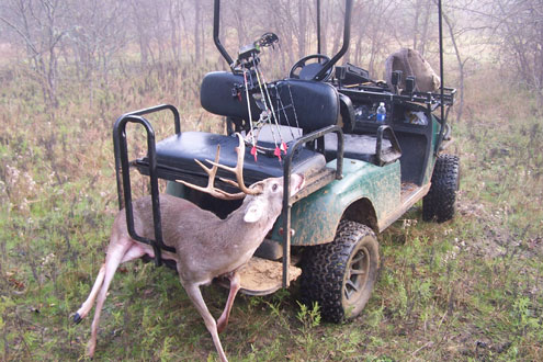 http://www.ntxe-news.com/artman/publish/article_86991.shtml Going all-electric By Luke Clayton Dec 16, 2013 [image / Luke Clayton http://www.ntxe-news.com/artman/uploads/1a1a1a1abuckbuggy4.jpg Luke has used his Intimidator electric vehicle made by Plano Golf Carts for the past two years. Here his Intimidator is put to work hauling a buck out of some very rough country two weeks ago ] Almost three years ago, Ken Blackstock and his brother Robert came out to my home with one of Ken’s Intimidator electric “hunting buggies” in tow. I have a friend who had been using one of these converted golf carts and he was highly impressed at not only the vehicle’s service off road but its low price when compared to nationally advertised units. With a price tag of about six thousand dollars, this sounded like just what I’d been looking for. But I must admit, I did have my misgivings. What kind of range could I expect from an electric ATV? Would it have the power I need to negotiate steep terrain? How often would I have to replace the batteries? I had visited with Blackstock on the phone several times and was anxious for us to drive the unit a mile or so from my home to some land that I have leased and put it through it’s paces. If one can fall in love with an inanimate piece of machinery, I fell in love with what became my own electric "hunting buggy!" It was whisper quiet, made no noise at all and, it was powerful. I never liked noisy ATVs with diesel or gasoline engines around areas where I hunt. With the three of us aboard, probably around 700 pounds, what was to become my personal hunting buggy easily traversed the steep grades of a couple of creek crossing and with the buggy’s high ground clearance, took us anyplace on the lease we wanted to go. I was impressed but concerned about run time between charges. How far can I travel on fully charged batteries? Ken said he often drives his machines 20 miles between charges and has had them go even farther during tests. We drove the buggy a couple hours and went into places on the lease that I had previously walked to. I was convinced that this rugged machine would serve my purposed on terrain in Texas but a partner and I also outfit elk and bear hunts up in northern Colorado. I wanted a machine that would do double duty up in the mountains. We have to traverse a couple thousand feet in elevation change over the course of a three mile drive. Could it do that, when hauling 3 or 4 men? I had watched some videos Blackstock filmed of his buggies traversing some grades as steep as any we deal with in Colorado and, with ease. After that initial test drive and watching the videos, I was sold. Ken and his brother left my home with an empty trailer. I had myself an electric machine that has since proven itself on many occasions during the course of the past thirty months. Battery life is excellent with these units. Robert Blackstock, Ken’s brother, has been using the same batteries for the past 4 years and his machine is every bit as powerful as the one I’ve been using for just over 2 years. After Blackstock works his conversion magic on what most of us know as a golf cart, a huge transformation takes place. I truly believe the term golf cart leads many folks to believe that these hunting buggies would be better suited for negotiating the smooth surfaces of greens on golf courses than the rough conditions encountered on a Texas deer lease of high country hunt in the mountains. Nothing could be farther from the truth! After the completion of the conversion, the only link these buggies have with a golf cart is the frame. Let’s take a look at what actually occurs when a EZ Go golf cart is stripped down to the frame and transformed into a vehicle well suited for negotiating rough country. First, says Blackstock, the basic 3 HP electric motor standard on golf carts is replaced with a powerful 9 HP motor made in the US. Next, the standard 175 amp controller is replaced with a 500 amp regenerative braking power controller. With this new controller, the vehicle comes to a stop on downhill grades when the accelerator petal is released. The batteries are actually recharging on downhill slopes as well. Standard leaf springs are replaced with heavy duty springs and heavy duty shocks. A 4 inch lift kit, new tie rods, 12 inch aluminum light weight mag wheels with 23 inch all terrain tires, and front wheel hubs are installed. With a complete rewiring with 4 gauge wire and new heavy duty batteries, a flip rear seat that converts into a bed, gun or bow racks, metal basket on the front, camo bodies and new seats, the transformation is completed. Electric vehicles are ideal for night hunting hogs or predators when staying on the move is the name of the game. I use mine for transporting corn to feeders and, as the accompanying image shows, hauling game out of the woods. In the course of the last two years, my buggy has saved me untold packing and dragging of game. My partner in our outfitting business and I pull our buggies up to the mountains north of Steamboat Colorado and we’ve found them to be worth their weight in gold in transporting hunters quietly into the areas we hunt elk and bear. On many occasion, we have had game walk across trails a few yard in front of the buggies. We live on a few acres in the country and seldom a day passes without our hunting buggy being put to work hauling wood, running to and from the mail box or just checking out the garden. My intent is not to bash gasoline or diesel off road vehicles. They seem to serve the purpose of many outdoor folks just fine. For my money, though, I choose electricity and I especially like the dollar savings these converted golf carts provide. Regardless whether I am on a photographic mission, scouting for game sign or actually hunting, I like to be quiet when I am in the outdoors. When I am on my Intimidator, the game never knows I am there. I like that. To learn more about these hunting buggies, visit