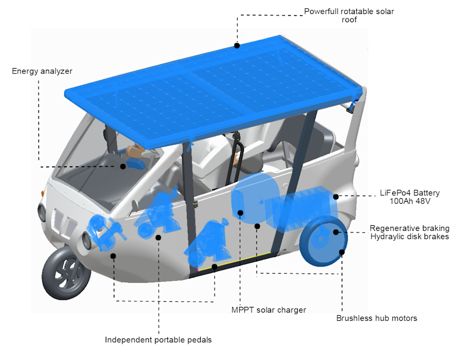 EVLN: e-tricycle relies on solar,pedal and battery power synergy