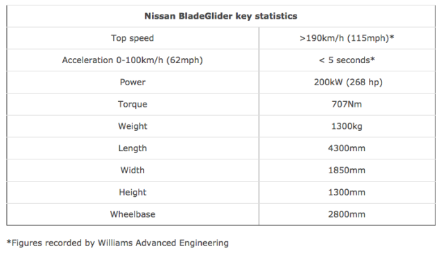 http://jalopnik.com/this-new-bladeglider-prototype-is-the-most-interesting-1784817642 This New BladeGlider Prototype Is The Most Interesting Thing Nissan's Made In Years 20160804 Kristen Lee [images / Nissan https://i.kinja-img.com/gawker-media/image/upload/s--vCXxeTK8--/c_scale,fl_progressive,q_80,w_800/behoafbafw7oq3dlpgeu.jpg https://i.kinja-img.com/gawker-media/image/upload/s--pvOhqw77--/c_scale,fl_progressive,q_80,w_800/i6yunc7ij0d0ntf9wrhk.jpg https://i.kinja-img.com/gawker-media/image/upload/s--Pxxz1n6Z--/c_scale,fl_progressive,q_80,w_800/cabxs5xvww371vsn14o4.jpg https://i.kinja-img.com/gawker-media/image/upload/s--bY13GiU_--/c_fit,fl_progressive,q_80,w_636/zvxuelpwmzhdr8ks9xrs.png stats https://i.kinja-img.com/gawker-media/image/upload/s--oMhhrrRx--/c_scale,fl_progressive,q_80,w_800/vpnpqlxgvqav0bfob9fh.jpg interior https://i.kinja-img.com/gawker-media/image/upload/s--tOLDIAhg--/c_scale,fl_progressive,q_80,w_800/krxqpbuioqgcebnvwtod.jpg https://i.kinja-img.com/gawker-media/image/upload/s--qGtLT6g_--/c_scale,fl_progressive,q_80,w_800/qfldxrchp3061txz0ugx.jpg ] Recall the radically rocket-shaped DeltaWing race car that resulted in a long and complicated legal dispute between Nissan and Panoz over the design and who owns it. Nissan’s BladeGlider concept and now prototype is just that, sorta, but for the road. And it’s the most interesting Nissan in a long time. First shown in concept form at the Tokyo Auto Show in the far back time of 2013, Nissan has said that it might put the BladeGlider into production. Might. Seeing this concept today leaves me tremendously hopeful. Nissan says that the zero-emissions working prototype helps continue its vision of creating a sleek electric vehicle that would shake up traditional automotive aesthetics. This is good news because the only other EV the Japanese automaker quietly produces, the Leaf, is anything but sleek. The prototypes have sweet rear-hinged dihedral doors and an open roof. And a three seat design—think McLaren F1. Power comes from a five module lithium-ion 220kW battery and drives the rear wheels. Stats are as follows: The BladeGlider also has torque vectoring and comes with three settings: off, agile and drift mode, for when you want to perform the Electric Slide. (Sorry, I had to.) As suggested by its name, Nissan prioritized aerodynamics in the design of the body. Inside, you’ll find four point safety harnesses for each of the three seats. The prototypes will meet the world in Rio de Janeiro in this month, just in time to catch the tail end of the shitstorm leading up to the Rio Olympics. All I can say to you, Nissan, is build it, please. People will buy it ... [© jalopnik.com] https://www.motoringresearch.com/car-news/features/bladeglider-electric-vehicle-car-lovers The BladeGlider is the ‘electric vehicle for car-lovers’ August 4, 2016 Gavin Braithwaite-Smith [images https://www.motoringresearch.com/wp-content/uploads/2016/08/12_Nissan_BladeGlider-1200x675.jpg Nissan BladeGlider https://www.motoringresearch.com/wp-content/uploads/2016/08/04_Nissan_BladeGlider-1200x675.jpg ] Nissan BladeGliderThe BladeGlider is Nissan’s vision of an electric future with a name that sounds like it’s ready to do battle in the new series of Robot Wars. It’s being unveiled in Rio de Janeiro, which just happens to be hosting a major sporting tournament, of which Nissan is a key sponsor. We cut to the chase to bring you more on the Nissan BladeGlider. A working prototype If the BladeGlider looks familiar, it’s because it’s based on the concept cars first shown at the 2013 Tokyo Auto Show. This new 2016 version looks a whole lot closer to production reality, although for the time being Nissan is keen to stress it’s a “working prototype”. An electric vehicle for car-lovers Note the narrow front leading to a wider rear track, which is said to improve aerodynamics and handling stability. According to Nissan supremo, Carlos Ghosn, the BladeGlider is an “electric vehicle for car-lovers”, which could be dismissed as a throwaway statement. That is until you take a look at the key specifications… A massive 521 lb ft of torque How does a top speed of 115 mph and a 0-62 mph time of sub five seconds grab you? And because the BladeGlider is 100% electric, the entire 268 hp and 521 lb ft of torque is available from the moment you hit the ‘go’ pedal. Well you can’t call it the ‘gas’ pedal. Or the ‘loud’ pedal, for that matter. With a little help from Williams The rear wheels are powered by two electric motors – one for each wheel – with British-based Williams Advanced Engineering lending a hand with the development of the powertrain. The motors are fed by a five-module lithium-ion 220 kW battery, with a bespoke cooling system developed to, well, keep things cool. Drift mode, yo That things about ‘car-lovers’ – the BladeGlider features a drift mode. Yes, you heard that right: somebody has taken a look at the Ford Focus RS and thought, anything you can do, we can do silently. Aside from the tyre screeches. And the inevitable screams from your two passengers. An electric McLaren F1? Oh yes, about that. Nissan has taken a look at another car with performance pedigree to design a three-seat cockpit. Bringing to mind images of the McLaren F1, the driver sits at the front of the BladeGlider, with each passenger sat behind in an off-set position, well placed to enjoy that drift mode. Torque vectoring The drift mode is part of a torque vectoring system, which automatically sends more torque to the outside wheel to correct any brown-trouser moments. There are three settings: Off, Agile and Drift. Last time we checked, drift mode wasn’t available on the Nissan Leaf. Look-at-me doors Once you’ve climbed aboard, having opened those ‘look at me’ rear-hinged dihedral doors, you’ll look up to discover an open roof with integrated roll-over protection, designed to provide “the exhilaration of an open-topped race
