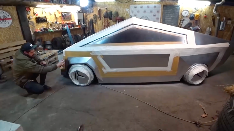 [images https://i.kinja-img.com/gawker-media/image/upload/c_scale,f_auto,fl_progressive,q_80,w_800/q2dghrycmljuidi3njo9.png https://i.kinja-img.com/gawker-media/image/upload/c_scale,f_auto,fl_progressive,q_80,w_800/osc07iqclhdtsx7bb37o.png https://i.kinja-img.com/gawker-media/image/upload/c_scale,f_auto,fl_progressive,q_80,w_800/l8qy4q17e9ge3jqy08pn.png Illustration for article titled This Cybertruck Knock-Off Can Be Yours For Just $10,800 Screenshot: YouTube share https://www.instagram.com/p/B6Oo67wiaPg/ kathleenromanovich No head lights, brake lights, turn signals or windsgield wipers. How can this knock off be road kegal even in Russia???? videos https://i.kinja-img.com/gawker-media/image/upload/c_scale,fl_progressive,q_80,w_800/nm4winlyiiofjm7ifwiu.mp4 Illustration for article titled This Cybertruck Knock-Off Can Be Yours For Just $10,800 Gif: YouTube https://youtu.be/kFrqIrCYOlM TESLA CYBERTRUCK ?????? ?????? ?? ??? 2109 ?? 80.000? ] You can’t buy Tesla’s electric Cybertruck yet, but you can get a vehicle that looks pretty close. All you need is 666,666 rubles ($10,800) and a laidback attitude. Why a laidback attitude? The fake Tesla-branded hubcaps are probably going to fall off, judging by a new video of the thing tearing through a parking lot outside Moscow. The knock-off Cybertruck is the work of a group of Russian YouTubers called Pushka Garazh who converted a Russian-made LADA hatchback into a wannabe Cybertruck. Think of it as less a retro-futuristic utility vehicle and more as a small car with spray-painted sheet metal welded on as a shell. The car has been spotted on roads outside Moscow and has popped up on social media, giving plenty of onlookers a good laugh. The single biggest problem with this faux-Cybertruck? It doesn’t have functioning side doors, which could be a problem in the minor event of something like a fire. The only way to get inside is through the back, as you can see during this pit stop where people stopped to take pictures of the strange car. The other name for something like this would be a death trap, of course. But how did this group of pranksters make the thing? Lots of planning and hard work, and even some video game graphics software. The group published a 43-minute video to YouTube showing precisely how they turned their old car into this strange behemoth on a budget of roughly $1,200. The group is clearly having fun converting an old Russian hatchback into the car of our dystopian dreams. Or nightmares, as it were. And it’s actually pretty fun to watch, since these guys clearly take car modifications seriously, even if they’re done on the cheap. Billionaire entrepreneur Elon Musk first unveiled his new electric Cybertruck concept back in November at an event in Los Angeles that featured plenty of hiccups. Most notably, a demonstration of the car’s supposedly impact-proof glass showed that the Cybertruck’s windows are relatively easy to damage. Musk was spotted just a couple of weeks later at a Malibu sushi restaurant, clearly wanting to get noticed. The Tesla founder definitely turned some heads, but not always in a good way. Musk ran over a sign while exiting the parking lot of the restaurant. The icing on the cake? The sign that Musk ran over was a left-turn only sign he bulldozed while making a right turn against some red lights [ http://electric-vehicle-discussion-list.413529.n4.nabble.com/Musk-Cybertruck-rush-exits-over-Malibu-CA-dinner-parking-cone-tp4695904.html ]. There are still a lot of questions about what the real Cybertruck will ultimately look like when it’s finally released in “late 2021,”—at least that’s the projected date according to Musk. And it’ll be really interesting to see whether Tesla can deliver on its price-point. The least expensive version will supposedly cost just $39,900, will tow up to 7,500 pounds, and will be able to carry a 3,500-pound payload in its bed. If you can’t wait until late 2021 and need your Cybertruck now, there’s always this fan-made version, assuming you can find a way to ship it from Russia to wherever you live. At just $10,700, it’s quite a steal, though it can’t tow 7,500 pounds. But much like the real Cybertruck, the fake Cybertruck doesn’t appear to have turn signals and side mirrors either. Now that’s what we call truly disruptive innovation. [© gizmodo.com] https://www.rt.com/russia/476832-tesla-cybertruck-fake-copy/ Hellish ride: Unique bootleg ‘Tesla Cybertruck’ goes on SALE in Russia for 666,666 rubles ... The ‘Cybertruck’ is in fact a LADA 2109 hatchback, plastered with sheet metal ... https://cdni.rt.com/files/2019.12/original/5e0404f6203027099a0ce372.png ... https://www.google.com/search?q=LADA+2109+hatchback&tbm=isch image search of LADA 2109 hatchback http://www.automotivetestdrivers.com/this-cybertruck-knock-off-can-be-yours-for-just-10-800-1840653550/ This Cybertruck Knock-Off Can Be Yours For Just $10,800 December 26 ... You can't buy Tesla's electric Cybertruck yet, but you can get a vehicle that looks pretty close. All you need is 666,666 rubles ($10,800) and a ... https://bgr.com/2019/12/26/cybertruck-tesla-russia-diy-knockoff-video/ This Cybertruck knockoff out of Russia is a sight to behold 2019/12/26 ... And while some critics were quick to lambaste the design and categorize the ... https://boygeniusreport.files.wordpress.com/2019/11/tesla-cybertruck-shot.jpg https://www.businessinsider.com/tesla-cybertruck-russian-youtubers-replica-video-pushka-garazh-2019-12 A Tesla Cybertruck knockoff made by Russian YouTubers has no doors and is powered by gasoline, but it's fooled people into thinking it's the real thing — here's how they did it. ... The YouTubers have reportedly put their Cybertruck replica up for sale, with a price tag of 666,666 rubles (around $10,700) ... https://image.businessinsider.com/5e04dad4855cc2394824c003 https://mashable.com/video/russian-knockoff-tesla-cybertruck/ 2019-12-26 ... made by russians · Behold th