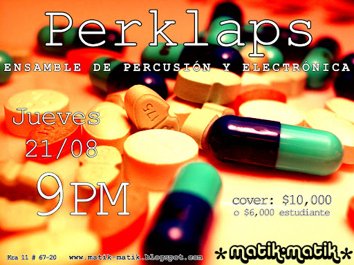 // <http://matik-matik.blogspot.com/> Concierto de Perklaps - 21 de agosto - 9PM // <http://matik-matik.blogspot.com/> http://2.bp.blogspot.com/_umXMR6tmEH4/SKpAe2sOUQI/AAAAAAAAAcs/0vKnbsX4AZI/s3 20/perklaps-copie-web.jpg Perklaps <http://www.myspace.com/perklaps> es un ensamble de percusión y electrónica en directo. creación, recreación de obras escritas, improvisación. perklaps surge en el 2007 como un conjunto de experimentación sonora con base en el procesamiento en tiempo real de instrumentos de percusión. está conformado por 3 perkusionistas, 1 ingeniero, 2 compositores. Cover : $10,000 o $6,000 estudiantes mas info en www.matik-matik.blogspot.com Benjamin *matik-matik*