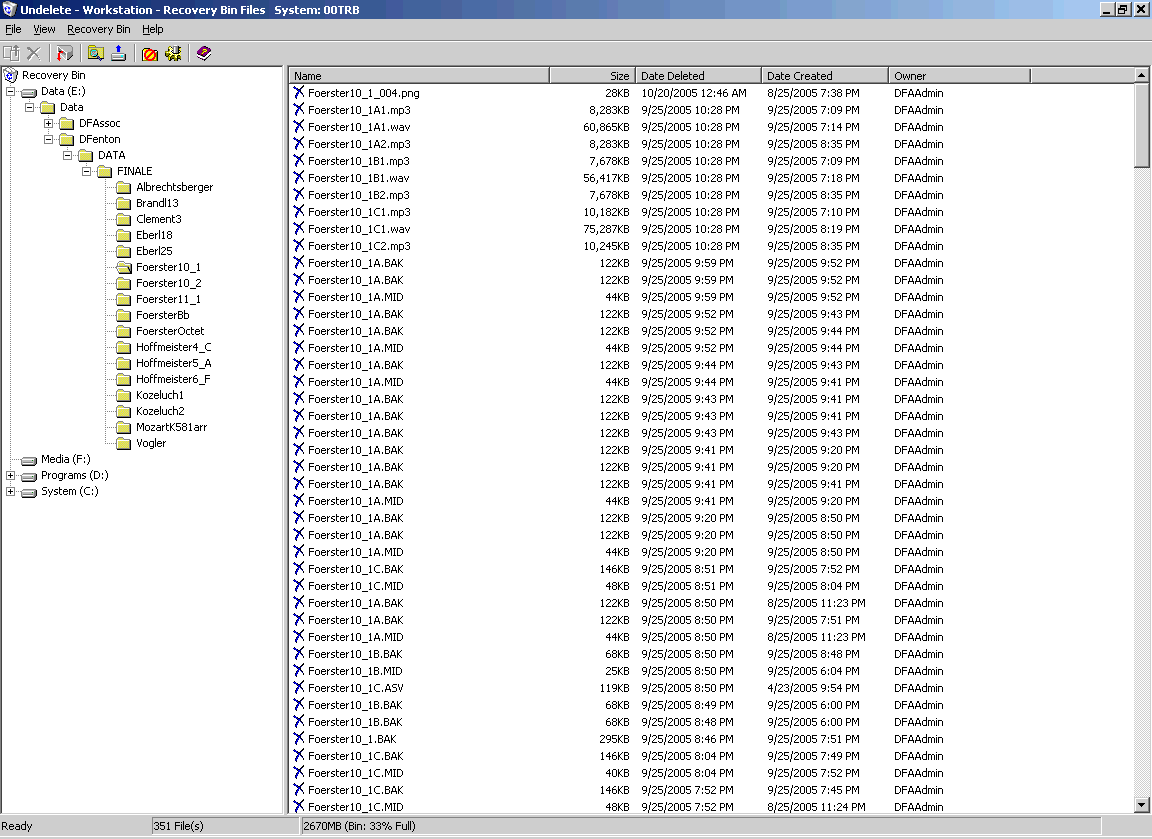 Well, I'm happy to explain it. When you delete a file, the sectors on disk that the file occupied are not actually wiped clean -- they are just marked as no longer in use. This is because the way file space is managed is with a lookup table (a file allocation table on FAT drives, a master file table on NTFS, and certainly some corresponding lookup structure in the Mac file systems). When files are created, the data is written to sectors on the disk and an entry made in the file table. When a file is deleted, the entry in the file table is just deleted, leaving the data where it was. It's as if in a library they de-accessioned books by removing the card from the card catalog -- the book would still sit there on the shelf until someone actually removed it to make room for a different book. Now, the result of this is that a simple undelete utility can in the best circumstances stitch together the deleted file simply by reading the sectors where it was stored before its entry in the file table was removed. Now, the hard part of this is figuring out which sectors have the deleted file's data in them. With FAT (the old DOS/Windows file system), the entry in the file table is not actually removed when the file is deleted, but, instead, the first letter of the file name is replaced with a placeholder, often represented onscreen as a question mark (I don't know if it's actually a question mark that's used in the entry itself -- could be, given the fact that "?" is prohibited in filenames on DOS/Windows systems). Now, you can see that with the sectors still holding the data and an entry remaining in the file table, it shouldn't be too hard to recover the data, and for years there were simple commandline undelete programs that allowed you to do this fairly easily. NTFS works differently in the way it handles deleted files, and I've never found a simple undelete program for it. I truly don't know the details with NTFS. But, in either file system, FAT or NTFS, there was one problem: Sectors that are marked as free could get overwritten with a new file, and you'd lose the data. You'd think that hard drive space would be allocated on a Last In/Last Out basis (i.e., if there are 10 sectors free when you delete a file, the 11th sector won't be used again until after the previous 10 have been re-used -- the last sesctor into the free disk space pool is the last to be written to). But LILO is actually inefficient, because efficiency in a file system has a lot of factors, such as size of the file (how many sectors it takes to store it), whether or not a file can fit into the next block of free space, whether or not there's some other free space where the entire file could be fit into contiguous sectors, whether there are parts of the disk that have faster access (the beginning or end of the drive) and whether those should be given preference for writing certain kinds of data. Now, the result is that you can't assume that just because you deleted a file a few minutes ago that the sectors it was in won't have immediately been re-allocated to a completely different file. Thus, simple undelete programs as described above cannot be relied upon to recover a file, and the longer you wait to try to recover the file, the lower your chances of success. This is where programs like Executive Undelete come in. They insert themselves into the low-level I/O operations of the file system and intercept calls to the subroutines that manage the free chain. What is the free chain? That's a list of available free space on the hard drive. A program like Executive Undelete takes control of the free chain and prevents a sector with a deleted file from ever reaching the top of the free chain (within certain limits, of course -- you can set expiration dates for the deleted files or a maximum proportion of disk space dedicated to protecing the deleted files). The result of this is that with a program like Finale, where there are lots of intermediate versions of your files deleted (every time the AutoSave kicks in the old file is deleted and replaced with the new one; same with the backup file), you end up with a set of shapshots of all versions of your file that are recoverable via your undelete program. Here's a screenshot of the list of deleted files in one folder: http://www.dfenton.com/images/ExecutiveUndelete.png That shows that all the incremental versions are available there (no AutoSave files listed there, though, because the files there were not open long enough for it to kick in -- I was just creating MIDI files there). Now, is this kind of utility necessary? No, of course not. Is it useful? Well, I don't use it very often, but when I need it, it saves a whole lot of work. And I don't have to worry about saving my Finale files (or any other files) under various names. I don't have to think about it at all -- it just happens in the background, and the data is available for me if I should ever need it. To me, that is far preferable to doing it manually for a number of reasons: 1. I could forget and not save to the new file name. 2. The extra files take up lots of disk space, whereas the deleted files take up no disk space at all. 3. I have available to me versions of the files in addition to the files whose names I manually incremented, including every save during a working session (not just the file as it stood at the end of the session). And it works for *all* my programs, not just for Finale. BUT IT IS AUTOMATIC -- it requires no thought on my part, so if I am asleep at the switch, I don't pay any price for my own mistakes (except for the time it takes to undelete the files from before my mistake). > And one of my faults (if that's what it is) is that my attitudes and > behaviors are more fundamentally informed by the aphorism, "A an ounce > of prevention is better than a gallon of cure." Does that mean you are big on preventive medicine and therefore don't have health insurance? -- David W. Fenton http://www.bway.net/~dfe