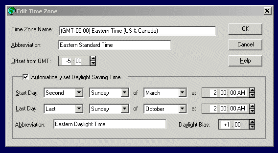 I don't think so. Timer servers have to supply time-zone agnostic time signals, which means they can't include settings for daylight savings and the like, because different regions in different time zones have different rules for when (and if) they enter DST. It *has* to be a local set of rules. The Windows tool for editing time zone settings looks like this when run on Win2K: http://www.dfenton.com/images/TimeZoneEdit.gif You'll see that it starts by defining the offset from Greenwich Mean Time. My understanding is that a time server supplies either GMT or GMT plus an offset and your OS uses its time zone rules to figure out what the local time is. -- David W. Fenton http://dfenton.com David Fenton Associates http://dfenton.com/DFA/ _______________________________________________ Finale mailing list [email protected] http://lists.shsu.edu/mailman/listinfo/finale