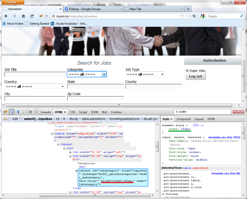 Here's a picture of the issue: http://i141.photobucket.com/albums/r63/Devil_Lock/CSSIssue_zps00c07ca2.png The URL is http://bizjob.biz/ Thank you -- You received this message because you are subscribed to the Google Groups "Firebug" group. To post to this group, send email to [email protected] To unsubscribe from this group, send email to [email protected] For more options, visit this group at https://groups.google.com/forum/#!forum/firebug