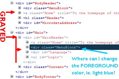 I have a question about the colors HTML Panel in Firebug: How can I change the foreground color (the text color) for a selected and 'grayed' element in the HTML panel? In the HTML panel some nodes are 'grayed' (see picture). I'm curious why these are grayed so if someone knows, please tell me, but it's not the main reason for this post: that is about the text color those gray nodes get when you select them. I want to change that (light blue) color! I played with the Windows 7 color themes that provide standard colors for a lot of windows elements like Titlebar, Button Face, Textcolor etc. and they impact the coloring of the HTML panel but I cannot seem to find this light blue....so your help is appreciated!!! -- You received this message because you are subscribed to the Google Groups "Firebug" group. To unsubscribe from this group and stop receiving emails from it, send an email to [email protected]. To post to this group, send email to [email protected]. Visit this group at https://groups.google.com/group/firebug. To view this discussion on the web visit https://groups.google.com/d/msgid/firebug/c5fb65c5-4c2a-468b-a2eb-71be9fdb15d0%40googlegroups.com. For more options, visit https://groups.google.com/d/optout.