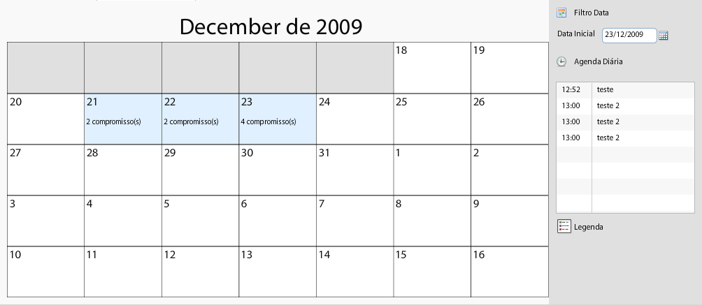 Não adianta eu ficar reclamando.Vamos a luta. Após umas 5 horas de trabalho já está quase pronto minha versão do calendário: Screenshot: http://www.cauirs.com.br/calendario.png Monto o calendário dinamicamente a partir de uma grid, extendi a gridItem assim cada data no calendário tem uma propriedade dia e compromissos que uso para exibir no grid ao lado os compromissos desse dia ( a partir do evento click do grid item). O que acham? (Não tem os drag'n drop do elixir nem a maneira intuitiva de criar evento, mas já quebra um galho) On 22 dez, 18:29, RafaelViana <[email protected]> wrote:É, realmente analisando do ponto de vista de uma empresa o preço sai bem barato, mas como profissional liberal em um primeiro projeto o preço fica meio salgado. Obrigado pelas opiniões, espero em breve adquirir esse componente. On 22 dez, 17:38, Mário Júnior <[email protected]> wrote:> Sem contar q o suporte deles é fantástico... bateu a dúvida e os helps > nao > ajudaram, entao vc manda uma parte do código pra eles (a parte q > interessa é> claro) explica oq vc precisa, e eles fazem pra vc te mandando o exemplo > funcional e comentado em detalhes. > Outra coisa é q se precisar fazer alguma alteracao (pqna claro) no > componente para atender ao seu caso específico, eles fazem. > Entao... pra quem já trabalhou com eles, não é caro não! O negócio é vc> saber cobrar do seu cliente, querer fazer uma "agenda" e cobrar 200 > pila> pelo projeto não dá né.> A mesma coisa com o pessoal da yFiles Flex > (http://www.yworks.com/en/products_yfilesflex_about.html), suporte > rapido e > eficiente, a única questao q tive de "ruim" com esse ultimo é q para > atender > as minhas especificacoes, muita coisa teria q ser mudada no componente, > oq> não compensava para nenhum dos lados... entao o negócio foi eu fazer no > braço :S > []s > 2009/12/22 Marcos Dantas <[email protected]> > > Compra a licença e incorpora no preço final do produto.> > Sem ele você vai levar muito mais tempo para desenvolver o produto > > final,> > fazendo as contas deve ficar mais barato. > > Abraços > > Marcos Dantas > > 2009/12/22 Michel Fernandes <[email protected]> > > Para uma empresa, na boa isso é dinheiro de pinga. > >> 2009/12/22 Bruno Carneiro <[email protected]> > >> Se você desenvolvesse algo parecido, quanto cobraria? > >>> -- > >>> Você recebeu esta mensagem porque está inscrito na lista "flexdev"> >>> Para enviar uma mensagem, envie um e-mail para > >>> [email protected]> >>> Para sair da lista, envie um email em branco para > >>> [email protected]> >>> Mais opções estão disponíveis > >>> emhttp://groups.google.com/group/flexdev> >> -- > >> Você recebeu esta mensagem porque está inscrito na lista "flexdev"> >> Para enviar uma mensagem, envie um e-mail para > >> [email protected]> >> Para sair da lista, envie um email em branco para > >> [email protected]> >> Mais opções estão disponíveis > >> emhttp://groups.google.com/group/flexdev> > -- > > Você recebeu esta mensagem porque está inscrito na lista "flexdev"> > Para enviar uma mensagem, envie um e-mail para > > [email protected]> > Para sair da lista, envie um email em branco para > > [email protected]> > Mais opções estão disponíveis > > emhttp://groups.google.com/group/flexdev> -- > Mario Junior > Enterprise Java / Flex Architectures > Adobe Certified Expert Flex 3 with AIR > Sofshore Informáticahttp://www.sofshore.com.br > +55 (48) 3337 2003> Rua Pastor Willian Richard Schisler Filho 452 sl 102, 88034-100 > Itacorubi> Florianopolis SC Brasil-- Você recebeu esta mensagem porque está inscrito na lista "flexdev" Para enviar uma mensagem, envie um e-mail para [email protected]Para sair da lista, envie um email em branco para [email protected] Mais opções estão disponíveis em http://groups.google.com/group/flexdev