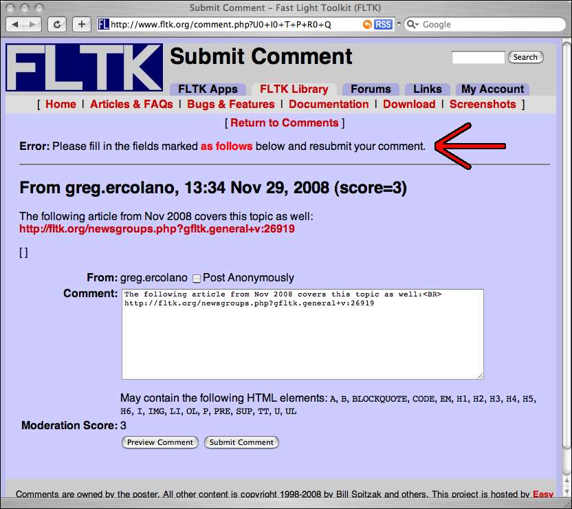 [STR New] Link: http://www.fltk.org/str.php?L2099 Version: 2.0-feature Tried making a comment to an article, but gives an error about a field not being specified, but no field appears to be unspecified. Here's a screenshot after hitting 'Submit Comment' showing the problem: http://seriss.com/people/erco/fltk/tmp/cantpostcomment.jpg Am I missing something? Link: http://www.fltk.org/str.php?L2099 Version: 2.0-feature _______________________________________________ fltk-bugs mailing list [email protected] http://lists.easysw.com/mailman/listinfo/fltk-bugs