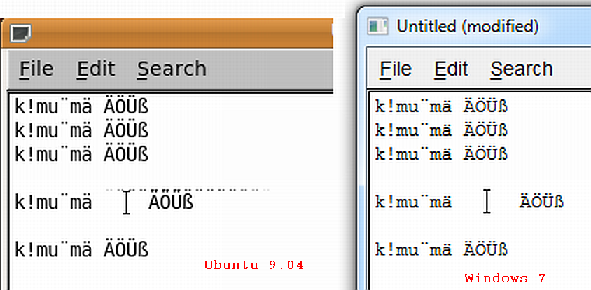 [STR New] Link: http://www.fltk.org/str.php?L2456 Version: 1.3-current I just found that Fl_Text_Editor still shows artifacts when characters (e.g. German upper-case Umlauts) are shifted around in the editor. Load this text in test/editor: ------------ k!mu¨mä ÃÃÃà k!mu¨mä ÃÃÃà k!mu¨mä ÃÃÃà k!mu¨mä ÃÃÃà k!mu¨mä ÃÃÃà ------------ Move the cursor in front of the string "ÃÃÃÃ", add 8 spaces, and then remove 4 of the spaces again. The result should look similar to the attached image 'editor.png'. Note that the Linux characters seem to be higher than the same characters on Windows 7, and that the caret seems to be not as high as the top-most pixels of the font on Linux. This might have to do with the effect seen. This has been tested and documented on Windows 7 and Linux (Ubuntu 9.04), see attached image. FLTK 1.3, svn r7891. I know that we had such problems earlier, but I thought that they had been fixed. Link: http://www.fltk.org/str.php?L2456 Version: 1.3-current Attachment: http://www.fltk.org/strfiles/2456/editor.png