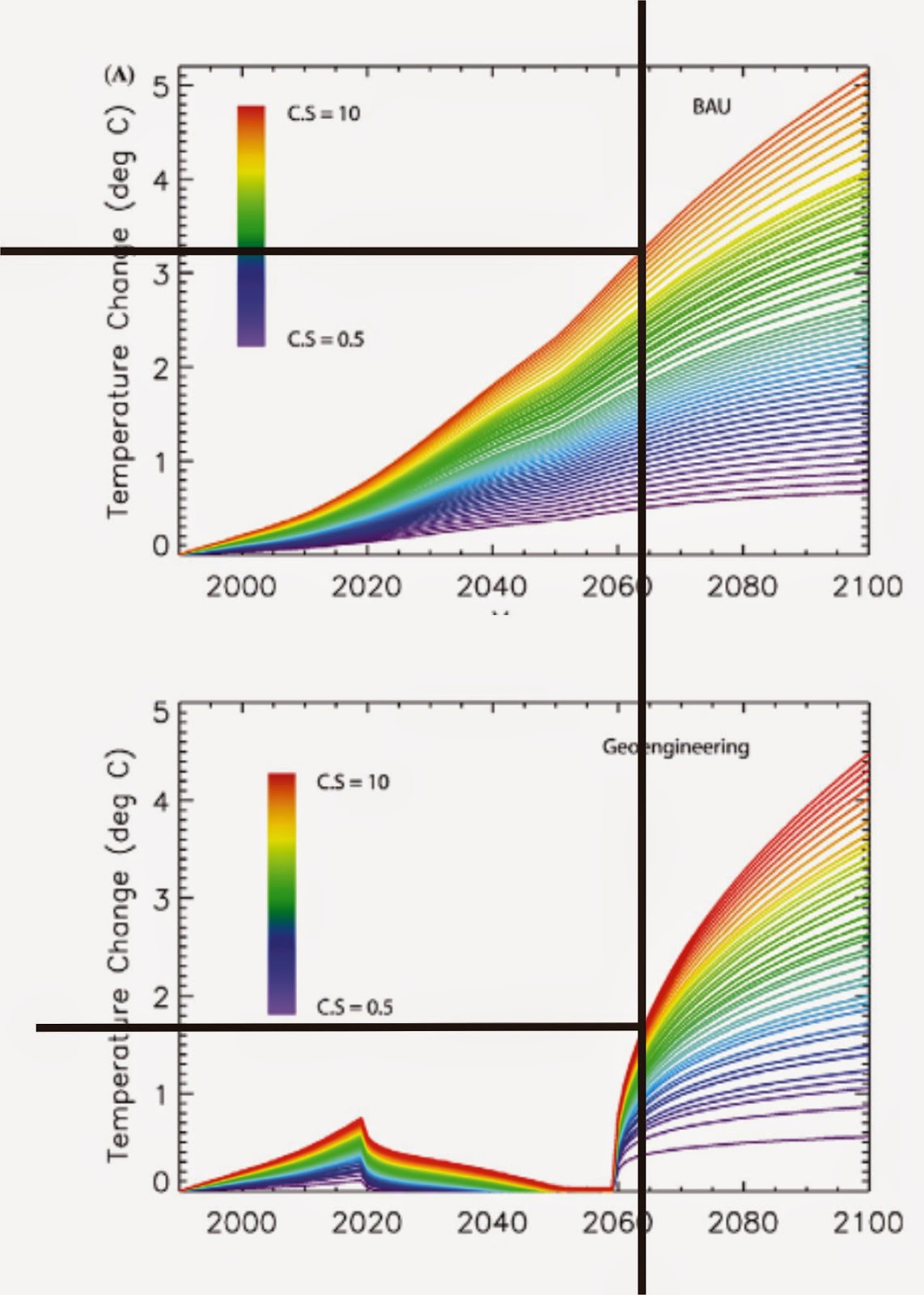 - re Andrew's: who cares? It's the rate that does you in (largely)? Oreskes and Conway present their scenario in a time period, i.e. they are talking about rates that do you in. They're saying a high rate of warming caused by stopping SRM persists long enough to drive the planet's temperature so high so fast it triggers their "fatal chain of events' that ends civilization. No scientist has found that a high rate of change caused by removing the influence of SRM could possibly persist long enough to drive the planet's temperature up to higher than the accumulated GHG would drive it had there had been no SRM. Oreskes and Conway write as if stopping a project aimed at cooling the planet is a new so far not that widely known about forcing that will warm it, therefore, no one had better ever try to cool it. They emphasize this idea by making a geoengineering-caused sudden spike in planetary temperature the villain in their plot, i.e. it is depicted as the trigger of the "fatal chain of events" that ends civilization. These are popular authors who made names for themselves among climate scientists and the general public with their last book *Merchants of Doubt*. What they say might become what many end up believing, and *there would be another meme*. Oreskes and Conway present themselves as being sincerely interested that what they say is accurate. Perhaps they might appreciate it if they were corrected. They've misunderstood the Ross and Matthews paper <http://iopscience.iop.org/1748-9326/4/4/045103/pdf/1748-9326_4_4_045103.pdf> they cite. The Ross and Matthews charts illustrating some of what they found in their paper are below. I drew the heavy black lines. The top chart is Ross and Matthews Figure 1(A) which depicts a number of model runs assuming a BAU emissions scenario with no geoengineering. Each line is a run that assumed a different climate sensitivity. The lower chart is their Figure 1(B) which depicts a similar set of model runs but SRM is simulated in all of them staring in 2020 and ending in 2059. I've drawn the heavy vertical black line at roughly year 2064 to supposedly make it easier to see that the two horizontal black lines are pointing to the temperature the models indicate at the highest sensitivity for that year, i.e. 2064. All sensitivities and all years indicate the same thing. I.e. if you apply SRM and stop, whatever the sensitivity, the planet is cooler than it would be if you didn't apply SRM. The planet is cooler at all times after you apply SRM, than it otherwise would be if you didn't apply SRM.