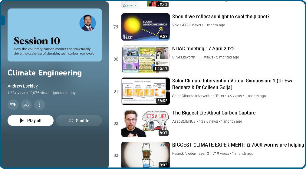 *“The Degrees Initiative is a UK-based NGO that builds the capacity of developing countries to evaluate solar radiation modification geoengineering (SRM). We believe that the Global South needs home-grown evidence and expertise to influence this critical debate. After ten years as a project housed within other organisations, Degrees has registered as a UK charity and is in a phase of ambitious expansion.”* ------------------------------ RESEARCH PAPERSCloud Seeding, Wildfire Smoke Emissions, and Solar Geoengineering: Why is Climate Modification Unregulated? <https://papers.ssrn.com/sol3/papers.cfm?abstract_id=4473753>The impacts of Stratospheric Aerosol Injection on Antarctic ice loss depend on injection location <https://www.authorea.com/doi/full/10.22541/essoar.168677217.72510223>Size distributions of sea salt aerosols for marine cloud brightening over the Great Barrier Reef <https://gfzpublic.gfz-potsdam.de/pubman/faces/ViewItemFullPage.jsp?itemId=item_5018746_1>Identifying key-psychological factors influencing the acceptance of yet emerging technologies–A multi-method-approach to inform climate policy <https://journals.plos.org/climate/article?id=10.1371/journal.pclm.0000207>Climate Projections Very Likely Underestimate Future Volcanic Forcing and Its Climatic Effects <https://agupubs.onlinelibrary.wiley.com/doi/10.1029/2023GL103743>Solar Geoengineering to Stop Annual Global Warming (Preprint) <https://www.researchgate.net/publication/369034073_Solar_Geoengineering_to_Stop_Annual_Global_Warming> <http://file:///C:/Users/user/Downloads/SSRN-id4473753.pdf> ------------------------------ THESISStarshades: Geoengineering Solutions and Technosignatures in Direct Imaging Phase Curves <https://lup.lub.lu.se/student-papers/record/9124347/file/9124371.pdf> <https://lup.lub.lu.se/luur/download?func=downloadFile&recordOId=9124347&fileOId=9124371> ------------------------------ WEB POSTSAre SRM scientists "boosters" or "blockers"? <https://peteirvine.substack.com/p/are-srm-scientists-boosters-or-blockers> Plan A+ Are SRM scientists "boosters" or "blockers"? <https://peteirvine.substack.com/p/are-srm-scientists-boosters-or-blockers?utm_source=substack&utm_campaign=post_embed&utm_medium=email> Are the scientists who study Solar Radiation Modification “boosters” as some critics suggest? Do they exaggerate its benefits while downplaying its risks, limitations and the challenges it presents? Do they instead display “an unusual self-reflexivity, as they are well aware of and seriously consider all the technology’s risks” as one… Read more <https://peteirvine.substack.com/p/are-srm-scientists-boosters-or-blockers?utm_source=substack&utm_campaign=post_embed&utm_medium=email> 6 days ago · 1 like · 3 comments · Pete Irvine EU braves climate storms by wading into geo-engineering debate <https://www.ft.com/content/8196059a-ecdf-4615-9f5d-ed1d4ab70cbd> ------------------------------ *UPCOMING EVENTS**The 21st International Conference on Nucleation & Atmospheric Aerosols by QUT School of Earth and Atmospheric Sciences and Centre for the Environment <https://www.icnaa2023.com.au/>| 26-30 June 2023**The Geoengineering Model Intercomparison Project (GeoMIP) 2023 meeting <https://sites.google.com/view/geomip-2023/home?pli=1>| 3-7 July 2023**Climate Engineering (GRS) <https://www.grc.org/climate-engineering-grs-conference/2024/>| 17-18 February 2024**GRC Climate Engineering 2024 <https://www.grc.org/climate-engineering-conference/2024/>| February 18-23, 2024PO* ------------------------------ *YOUTUBE VIDEOS**Cutting warming down to size by cooling the ocean surface to the preindustrial level in 226 years | Thermodynamic Geoengineering* <https://www.youtube.com/watch?v=0QnX3HANrlo> *“93% of the heat of global warming is going into the ocean. This heat can be partially converted to work and the balance sent to deep water where it provides a 226 year climate hiatus.”* *There's a playlist with videos on the Solar Geoengineering topic, you can check it out here: <https://substack.com/redirect/504b00fd-3f8c-471e-a121-97f84a867295?j=eyJ1IjoiMjJrMHl3In0.wQQsFypG52typ8FI2nhnJ8eUoUIIkdCkuhmzxNYKtgE>* <https://substackcdn.com/image/fetch/f_auto,q_auto:good,fl_progressive:steep/https%3A%2F%2Fsubstack-post-media.s3.amazonaws.com%2Fpublic%2Fimages%2F027c3231-322c-4a48-8bd7-2ae68b6a4265_1011x558.jpeg> -- You received this message because you are subscribed to the Google Groups "geoengineering" group. To unsubscribe from this group and stop receiving emails from it, send an email to [email protected]. To view this discussion on the web visit https://groups.google.com/d/msgid/geoengineering/CAHJsh98uVZUeDqKEnyhzovnfq-TqX1Ut6huu46wLuRH_u8Zgow%40mail.gmail.com.