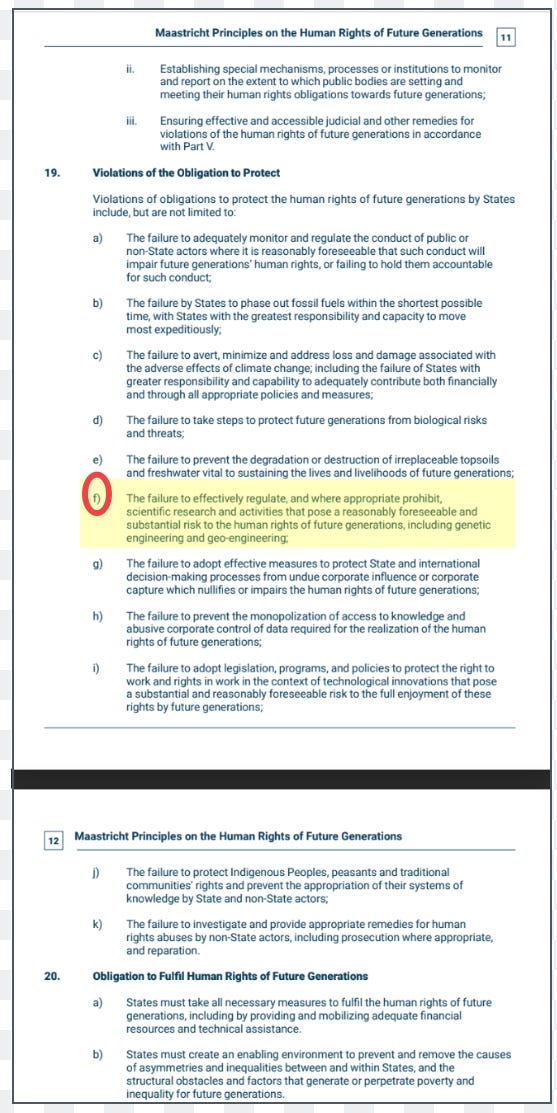 *July 2023* The recently launched Maastricht Priciples document claims that future generations have human rights and that States have legal obligations to protect them. *Principle 19 f) talks about the risks of geoengineering.* <https://substackcdn.com/image/fetch/f_auto,q_auto:good,fl_progressive:steep/https%3A%2F%2Fsubstack-post-media.s3.amazonaws.com%2Fpublic%2Fimages%2F83f3350e-c5b3-4ea7-ab9e-fd361b9ddfc8_664x923.png> <https://substackcdn.com/image/fetch/f_auto,q_auto:good,fl_progressive:steep/https%3A%2F%2Fsubstack-post-media.s3.amazonaws.com%2Fpublic%2Fimages%2Ff9d2d02b-ea38-4fab-9aca-fa1bebcecdbe_636x836.png> <https://substackcdn.com/image/fetch/f_auto,q_auto:good,fl_progressive:steep/https%3A%2F%2Fsubstack-post-media.s3.amazonaws.com%2Fpublic%2Fimages%2F980df093-e04b-4185-9fd6-671e5098fd43_557x1113.png> *Source: Rights of Future Generations* -- You received this message because you are subscribed to the Google Groups "geoengineering" group. To unsubscribe from this group and stop receiving emails from it, send an email to [email protected]. To view this discussion on the web visit https://groups.google.com/d/msgid/geoengineering/CAHJsh9-%3D2Mq90paL3w-8hmxXsOEt%2BqG0MAKabpvtKm1bmiNe6w%40mail.gmail.com.