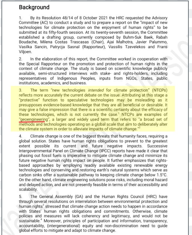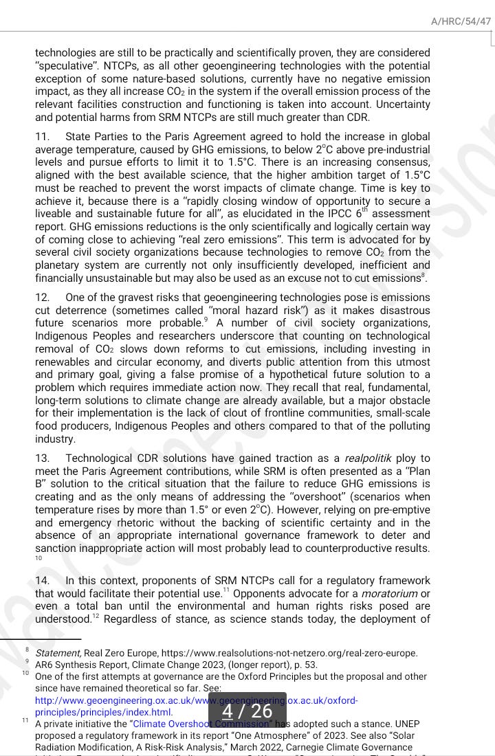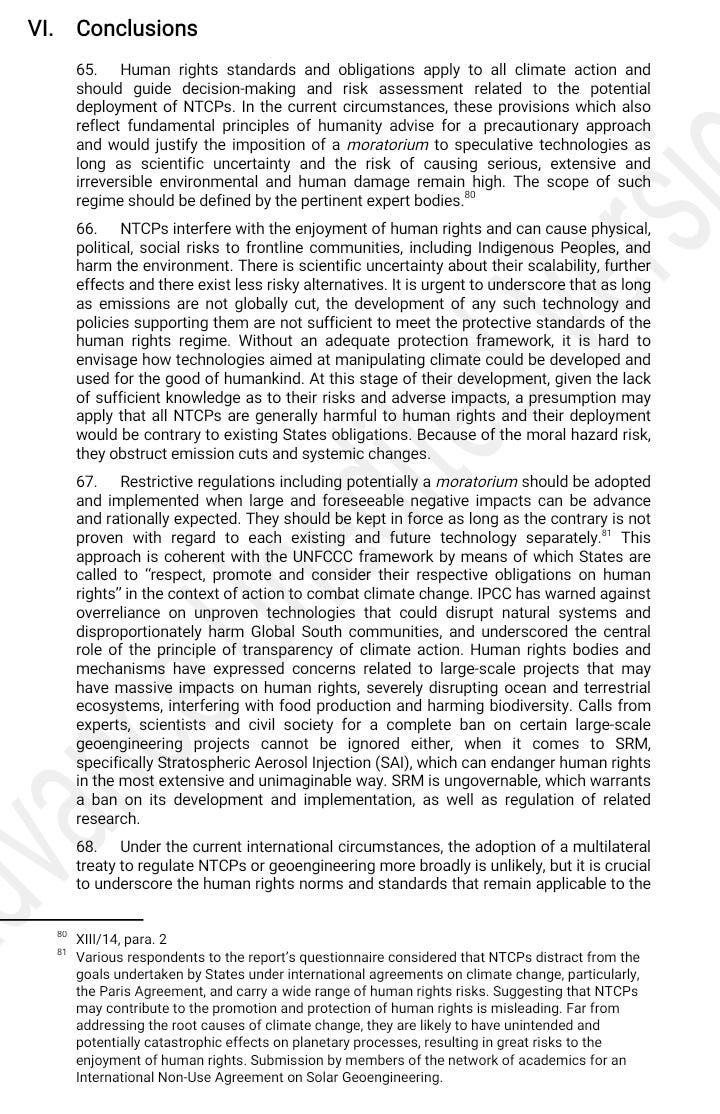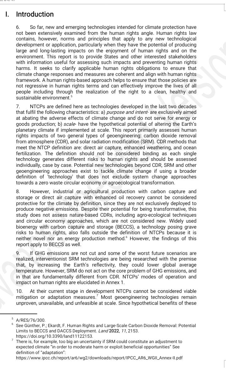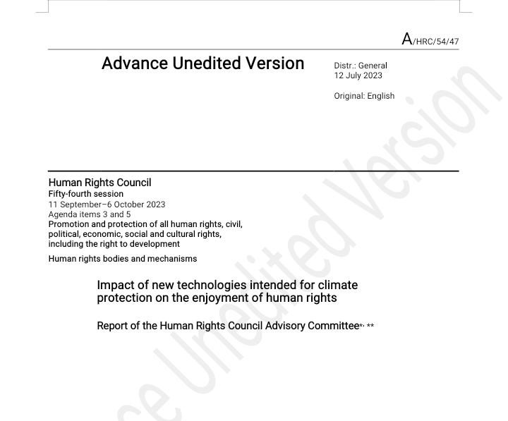 The UN Human Rights Council and the prosecution's case against SRMA new report by the UN Human Rights Council's Advisory Committee provides a highly skewed case against CDR and SRM that fails to do the human rights issues these technologies raise justice *By Pete Irvine* *Substack (PlanA+)* *09 August 2023* <https://peteirvine.substack.com/p/the-un-human-rights-council-and-the/comments> This week the UN Human Rights Council heard the findings of a new report <https://t.co/lUAMmAdLOM> prepared by it’s advisory committee. Far from being an impartial review of the issue, it reads more like the case for the prosecution in the trial against Solar Radiation Modification (SRM) and Carbon Dioxide Removal (CDR). [image: United Nations Human Rights Council | Digital Watch Observatory] <https://substackcdn.com/image/fetch/f_auto,q_auto:good,fl_progressive:steep/https%3A%2F%2Fsubstack-post-media.s3.amazonaws.com%2Fpublic%2Fimages%2Ffc7a4fef-e54e-4ece-889f-28c739db22f4_600x450.jpeg> The case against CDR and SRM The report begins by setting out its definitions. “New Technologies *intended* for Climate Protection (NTCP)” is the term it uses to cover SRM and CDR and it wastes no time getting in it’s first blows against these ideas, stressing the uncertainties and risks associated with these ideas which justify the emphasis on *intended*. It then stresses the threat that climate change poses and explains that *“States have human rights obligations to prevent to the greatest extent possible its current and future negative impacts.” *As CDR and SRM offer the potential to reduce those negative impacts you might expect that there is a case for them on the basis of these human rights obligations. However, the authors immediately argue that the only way to discharge those obligations is to pursue certain specific policies, i.e., rapid fossil fuel phase-out, the build-out of renewables and the restoration of natural ecosystems. After the introduction, the report opens a section on the “Risks and side-effects” of SRM and CDR, that as the title suggests gives an entirely one-sided account that neglects to mention any potential benefits. As the report goes on, at every turn they stress that we have everything we need to solve the climate problem and that CDR and SRM are unreliable, counter-productive, and dangerous distractions from implementing true solutions to climate change. The report is full of bold and often completely unsubstantiated claims about CDR and SRM’s negative impacts, the biases of researchers in these fields, and the sinister role of fossil fuel interests in promoting these ideas. It would take too long to list all these instances of bias, but here are a few illustrative quotes: “NTCPs… with the potential exception of some nature-based solutions, currently have no negative emission impact, as they all increase CO2 in the system if the overall emission process of the relevant facilities construction and functioning is taken into account.” (Paragraph 10) Referring to all SRM and CDR proposals without distinction, the authors claim: “The magnitude of the potential negative socio-economic and human rights impacts is currently incommensurable to any hypothetical benefits.” (Paragraph 46) On the possibilities for international governance: “SRM proponents recommend a well-structured global governance of it, but an international agreement on usage of such a controversial and uncertain technique borders on the impossible if it is not to ban it completely.” (Paragraph 28) The case for the Defence The report draws on a number of legal concepts and human rights obligations to argue for a moratorium on all SRM and CDR activities, but many of these arguments could be reversed. The precautionary principle As the report notes, Principle 15 of the 1992 Rio Declaration declared: “In order to protect the environment, the precautionary approach shall be widely applied by States according to their capabilities. Where there are threats of serious or irreversible damage, lack of full scientific certainty shall not be used as a reason for postponing cost-effective measures to prevent environmental degradation” [image: Rio Declaration] <https://substackcdn.com/image/fetch/f_auto,q_auto:good,fl_progressive:steep/https%3A%2F%2Fsubstack-post-media.s3.amazonaws.com%2Fpublic%2Fimages%2F8b9d8413-66e7-4fce-b9db-16bfa67febc7_275x183.png> Does climate change not pose a threat of serious or irreversible harm? If so, it seems that an argument could be made for developing and deploying CDR and SRM, even though there is a “lack of full scientific certainty.” If the climate were not changing then it seems clear that the precautionary principle would argue strongly against such interventions, but as there is a clear and growing danger from climate change the precautionary principle clearly cuts both ways. The report argues that whenever there is an alternative option to some policy then only the more preferable option should be pursued. However, this seems contrary to the Rio Declaration’s focus on “cost-effective measures” as a mix of technologies or policies is often a more cost-effective than focusing exclusively on a single approach. The report suggests that “a *moratorium* on fossil fuel extraction could be the less potentially harmful option.” But the obvious and disastrous economic impacts of a moratorium on all fossil fuel extraction (not exploration, or licensing for which a reasonable case could be made) suggest that it might fail the “cost-effective” requirement in the Rio Declaration. Climate change and Human Rights Climate change is widely recognized to be a human rights issue, as its impacts would threaten the enjoyment of many crucial human rights. As the foreword to the UN Environment Program’s Climate Change and Human Rights report <https://wedocs.unep.org/bitstream/handle/20.500.11822/9530/-Climate_Change_and_Human_Rightshuman-rights-climate-change.pdf.pdf?seque
