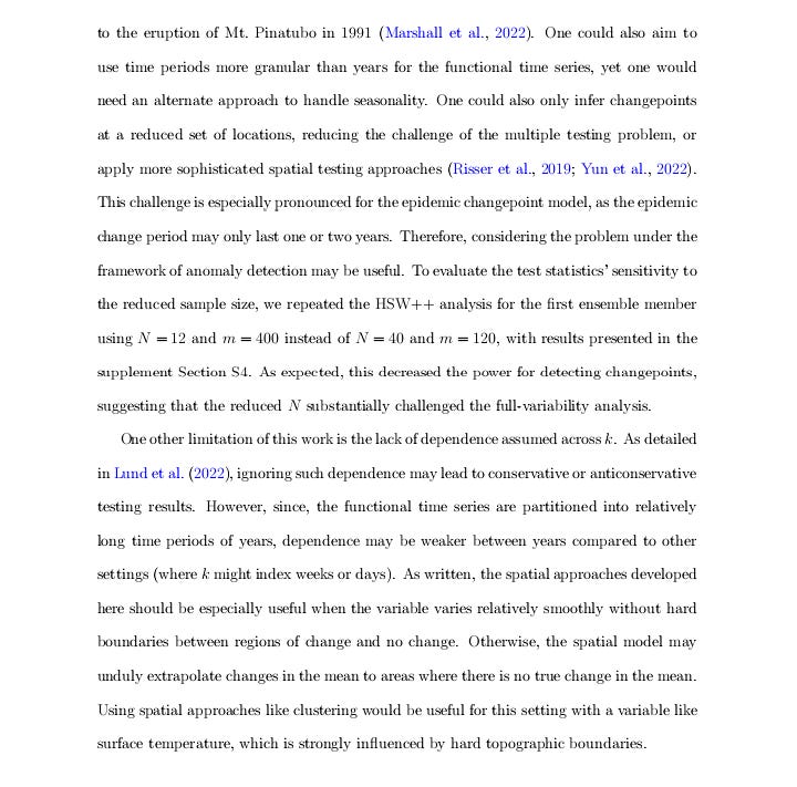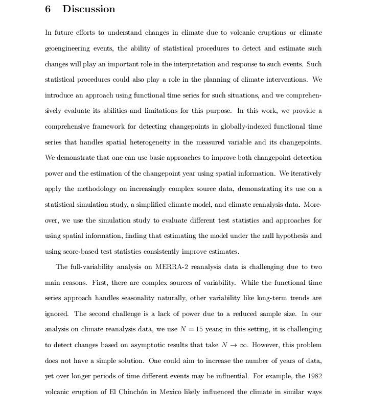 *Authors* Drew Yarger, J. Derek Tucker *11 August 2023* https://doi.org/10.48550/arXiv.2308.05915 *Abstract* In environmental and climate data, there is often an interest in determining if and when changes occur in a system. *Such changes may result from localized sources in space and time like a volcanic eruption or climate geoengineering events*. Detecting such events and their subsequent influence on climate has important policy implications. However, the climate system is complex, and such changes can be challenging to detect. One statistical perspective for changepoint detection is functional time series, where one observes an entire function at each time point. We will consider the context where each time point is a year, and we observe a function of temperature indexed by day of the year. Furthermore, such data is measured at many spatial locations on Earth, which motivates accommodating sets of functional time series that are spatially-indexed on a sphere. Simultaneously inferring changes that can occur at different times for different locations is challenging. We propose test statistics for detecting these changepoints, and we evaluate performance using varying levels of data complexity, including a simulation study, simplified climate model simulations, and climate reanalysis data. We evaluate changes in stratospheric temperature globally over 1984-1998. Such changes may be associated with the eruption of Mt. Pinatubo in 1991. <https://substackcdn.com/image/fetch/f_auto,q_auto:good,fl_progressive:steep/https%3A%2F%2Fsubstack-post-media.s3.amazonaws.com%2Fpublic%2Fimages%2F08f3de3b-d59f-4bdd-a31f-c754c62ceabc_720x809.png> <https://substackcdn.com/image/fetch/f_auto,q_auto:good,fl_progressive:steep/https%3A%2F%2Fsubstack-post-media.s3.amazonaws.com%2Fpublic%2Fimages%2F89894674-4bcd-4d78-8199-1bcdceae773b_720x711.png> *Source: arXiv* -- You received this message because you are subscribed to the Google Groups "geoengineering" group. To unsubscribe from this group and stop receiving emails from it, send an email to [email protected]. To view this discussion on the web visit https://groups.google.com/d/msgid/geoengineering/CAHJsh9-KL3DVsec3DCuuAc4vDgTUHiS2G6xKwuT9ed5U27OUHw%40mail.gmail.com.