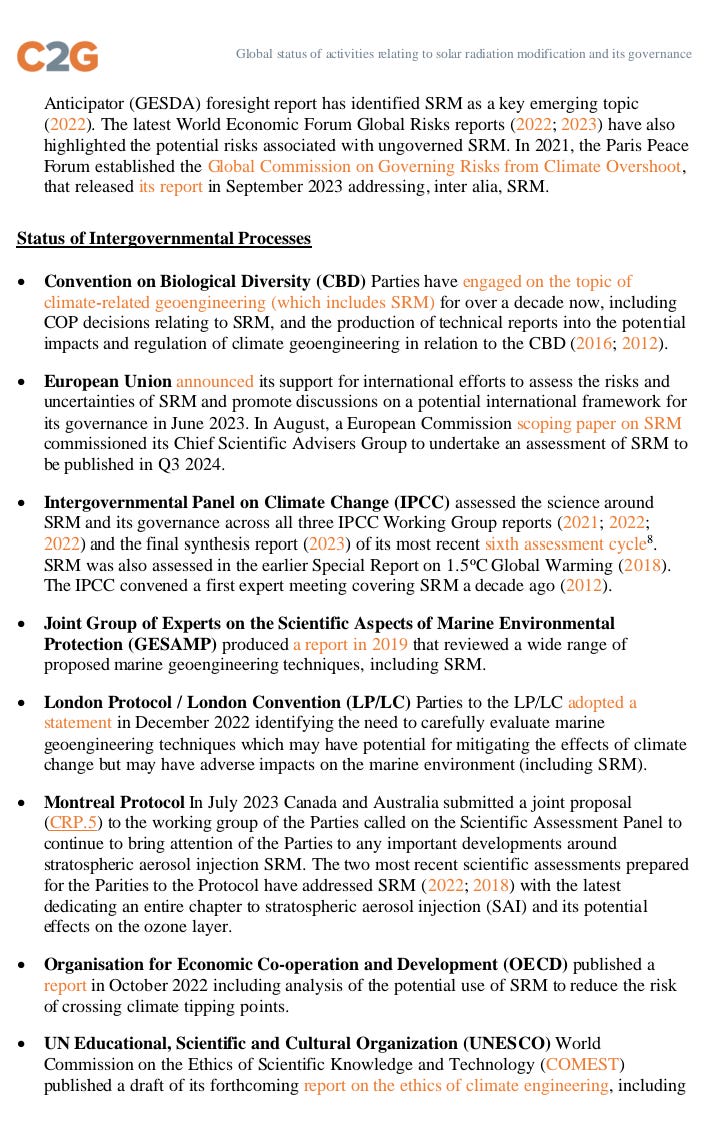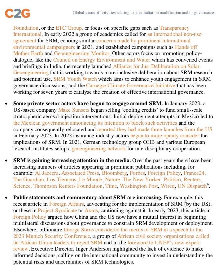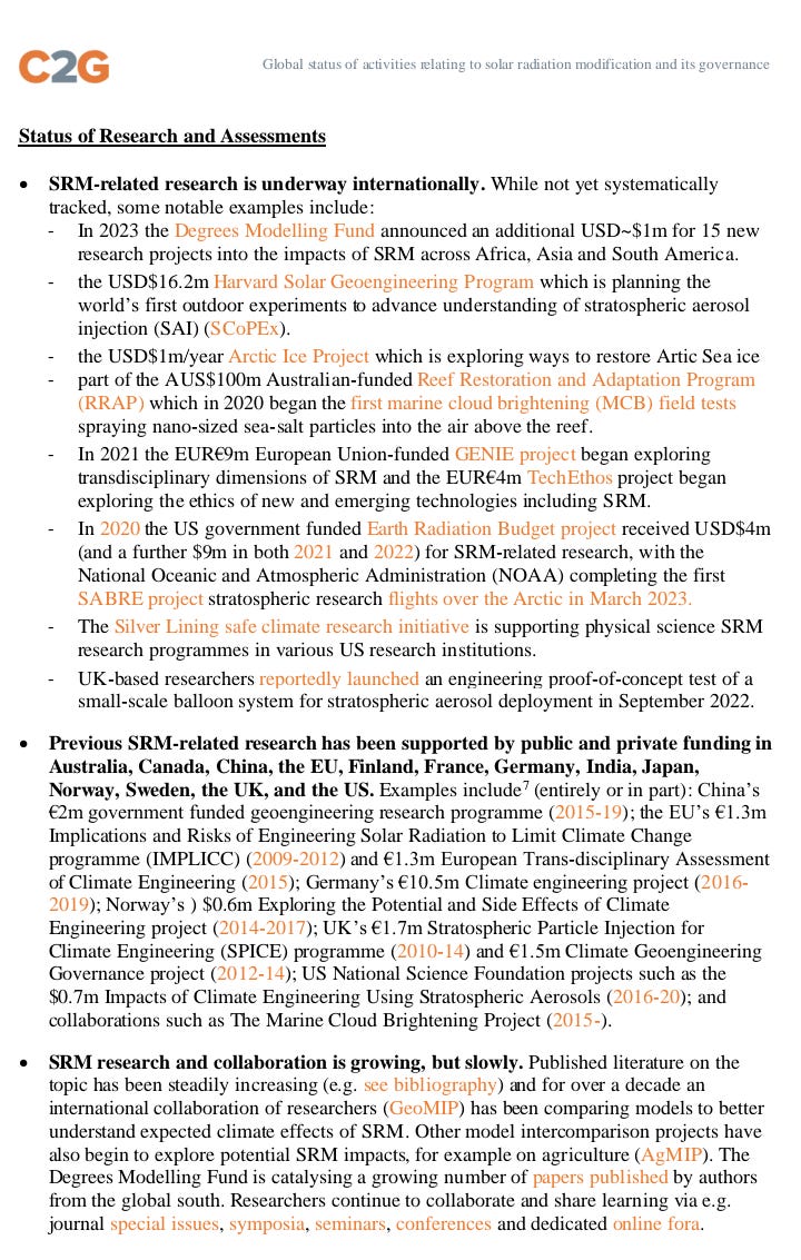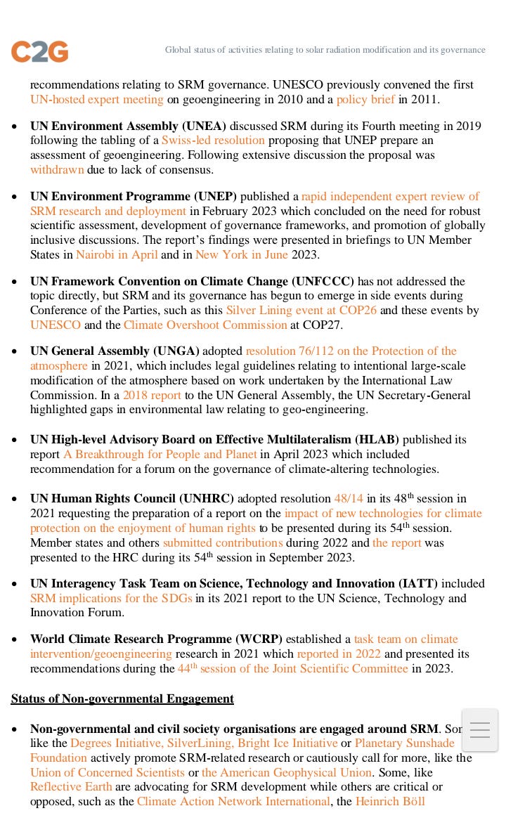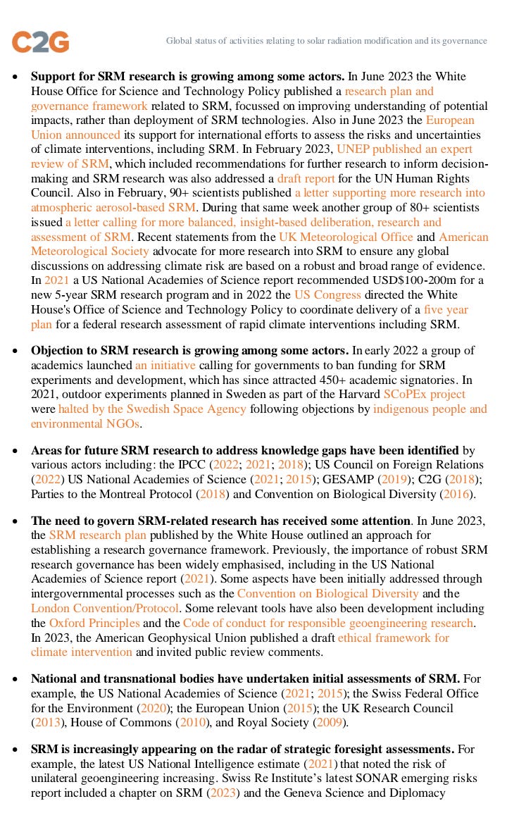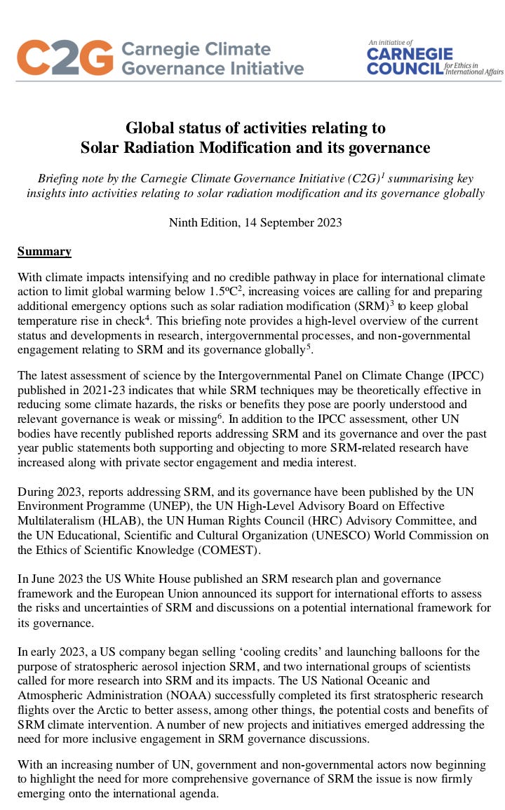 carnegiecouncil.co/44YaJ2n Briefing note by the Carnegie Climate Governance Initiative (C2G) summarising key insights into activities relating to solar radiation modification and its governance globally
