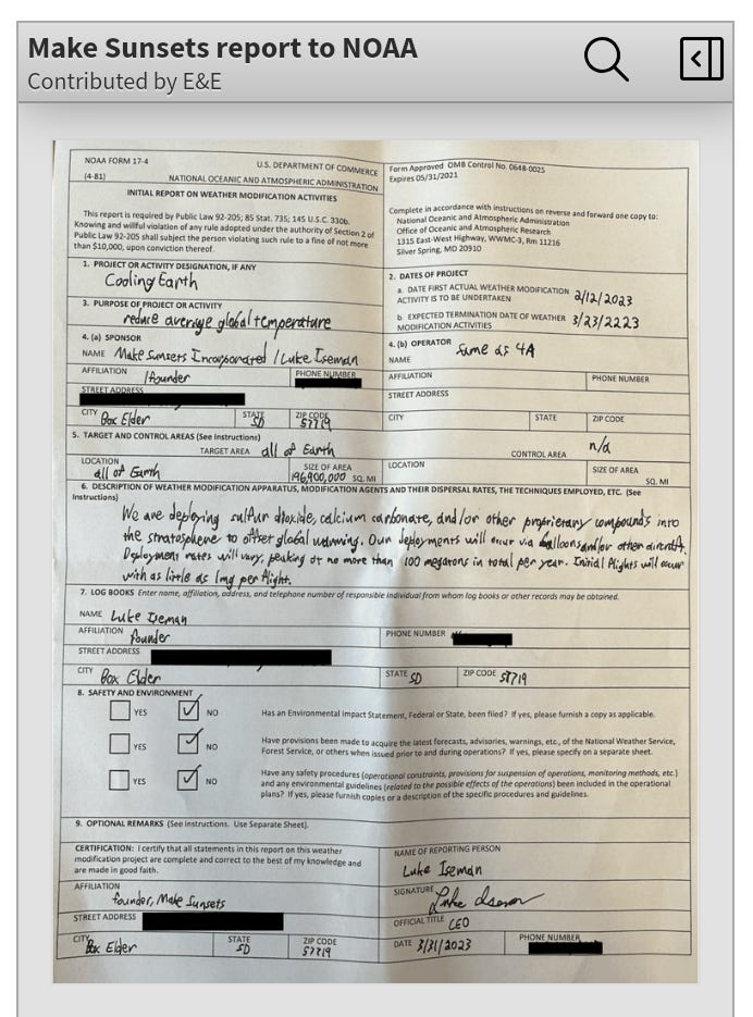 https://www.eenews.net/articles/noaa-gets-dire-warning-about-solar-geoengineering/ *By Robin Bravender | 03/25/2024* The agency is being asked to strengthen a toothless rule that requires only a heads-up before experiments to modify the weather. As a Phoenix heat wave is killing hundreds of people, an entrepreneur approaches the city’s mayor with an extraordinary offer. The company will spray enough aerosols into the sky to reduce temperatures near Phoenix for a week, until the heat wave passes. It’s a tempting offer that could save lives, although the science surrounding what happens next isn’t clear. Such a scenario might once have been the stuff of science fiction novels, but it’s no longer far-fetched, said David Bookbinder, a longtime climate attorney who previously served as Sierra Club’s chief climate counsel. He and other climate experts fear that regulators aren’t ready for what’s coming. “I am more concerned about this than anything else,” Bookbinder said in a recent interview. Climate solutions “are not going to get deployed in time, which is only going to create more of a demand for something like this.” As the climate continues to heat up and humanity feels the scorching, sometimes deadly, consequences, environmentalists, scientists and business executives are increasingly interested in exploring solar geoengineering technologies that could blunt some of those effects. That includes injecting aerosols into the stratosphere to reflect sunlight away from the planet, also known as solar radiation modification. But meddling with the climate is contentious, and efforts to regulate — or even study — geoengineering on a large scale have proven difficult both domestically and internationally. Currently, a U.S. company or citizen with plans to inject aerosols into the atmosphere is required to fill out a one-page form <https://library.oarcloud.noaa.gov/noaa_documents.lib/OAR/OWAQ/Weather_Modification_Project/Administrative/WxMod_Form17-4.pdf> with the Commerce Department 10 days before they do so, thanks to a law from the 1970s that requires reporting of efforts to modify the weather. That’s not enough, say academics and researchers who are urging the government to expand their rules governing private firms’ solar radiation modification efforts. It’s part of a broader push to regulate small-scale geoengineering experiments that are already happening. “There’s no governance on the international level, national governance, there’s no state governance, there’s nothing,” said Bookbinder. Bookbinder represented environmental groups during his tenure at Sierra Club in the landmark climate case *Massachusetts* *v. EPA, *which confirmed the agency’s authority to regulate greenhouse gases as pollutants under the Clean Air Act. He went on to work for the Niskanen Center, a libertarian think tank. He’s now self-employed. Bookbinder is agnostic on whether geoengineering technologies should be deployed, he said, but he’s worried it could be done without proper oversight and that the United States and international governments aren’t prepared to keep it in check. It’s been on his mind for a few years, Bookbinder said, since he started wondering about “the next big problem that we’re not thinking about yet.” “I said, ‘Holy shit, it’s not the climate change.’ We know what that is. We know how it’s proceeding,” Bookbinder said. “It’s going to be the solutions that people start offering up.” Fodder for science fiction Scientists know that aerosol particles can cool the Earth’s surface because they temporarily reflect sunlight. The 1991 eruption of Mount Pinatubo in the Philippines, for example, lowered the average global temperature <https://earthobservatory.nasa.gov/images/1510/global-effects-of-mount-pinatubo> by about 1 degree Fahrenheit for roughly a year. But widespread questions remain about the scientific and geopolitical implications of injecting aerosols into the upper atmosphere to modify the climate. Potential risks could include damage to the ozone or changes to weather patterns — possibly impacting other countries. Geoengineering also doesn’t address other harms associated with producing and burning fossil fuels, such as local pollution and ocean acidification. And if a country or company were to implement a major geoengineering scheme, it would have to continue until carbon concentrations in the atmosphere fell to a safe level or risk triggering a catastrophic spike in global warming — a risk known as termination shock. A proposal to study solar geoengineering was withdrawn from consideration <https://subscriber.politicopro.com/article/eenews/2024/03/01/solar-geoengineering-proposal-withdrawn-at-un-summit-00144175> at a U.N. Environment Assembly earlier this year after nations failed to reach agreement over how to approach the contentious issue. Bookbinder pointed to a scenario laid out in the 2020 climate fiction novel “Ministry for the Future” by Kim Stanley Robinson. Geoengineering is central in the novel <https://www.bbc.com/future/article/20231010-sun-solar-geoengineering-ministry-for-the-future-kim-stanley-robinson>, which depicts India suffering from a deadly heat wave and spraying aerosols into the stratosphere. If something like that were to happen in the real world, “suppose then the monsoon fails over India and China has a disastrous drought or heat wave,” Bookbinder said. “Who do you think they’re gonna blame? The geopolitical problems that can come if people start doing this on a national scale are beyond imagining.” ‘Gaps’ in government rules? International doomsday scenarios are Bookbinder’s biggest worry, he said. On a smaller scale, he’s hoping to get the regulatory ball rolling by prodding the U.S. government to update 1970s-era rules that track efforts to modify the weather. “As climate change accelerates and its damages mount, the investigation and testing of so