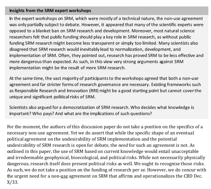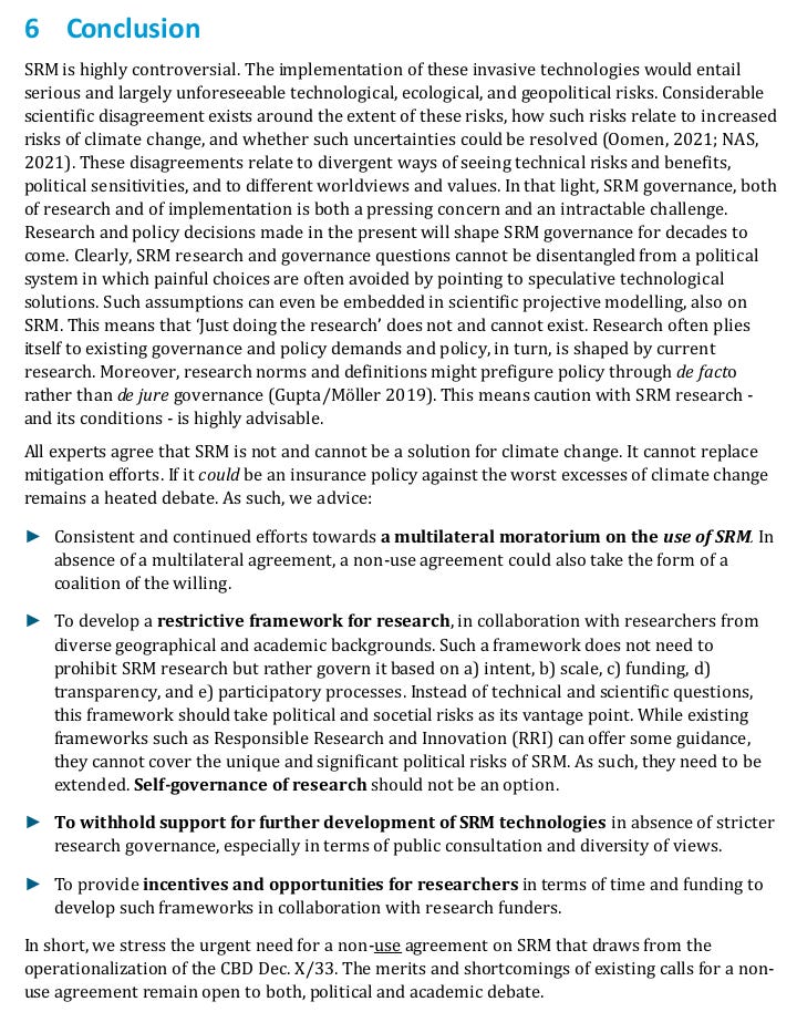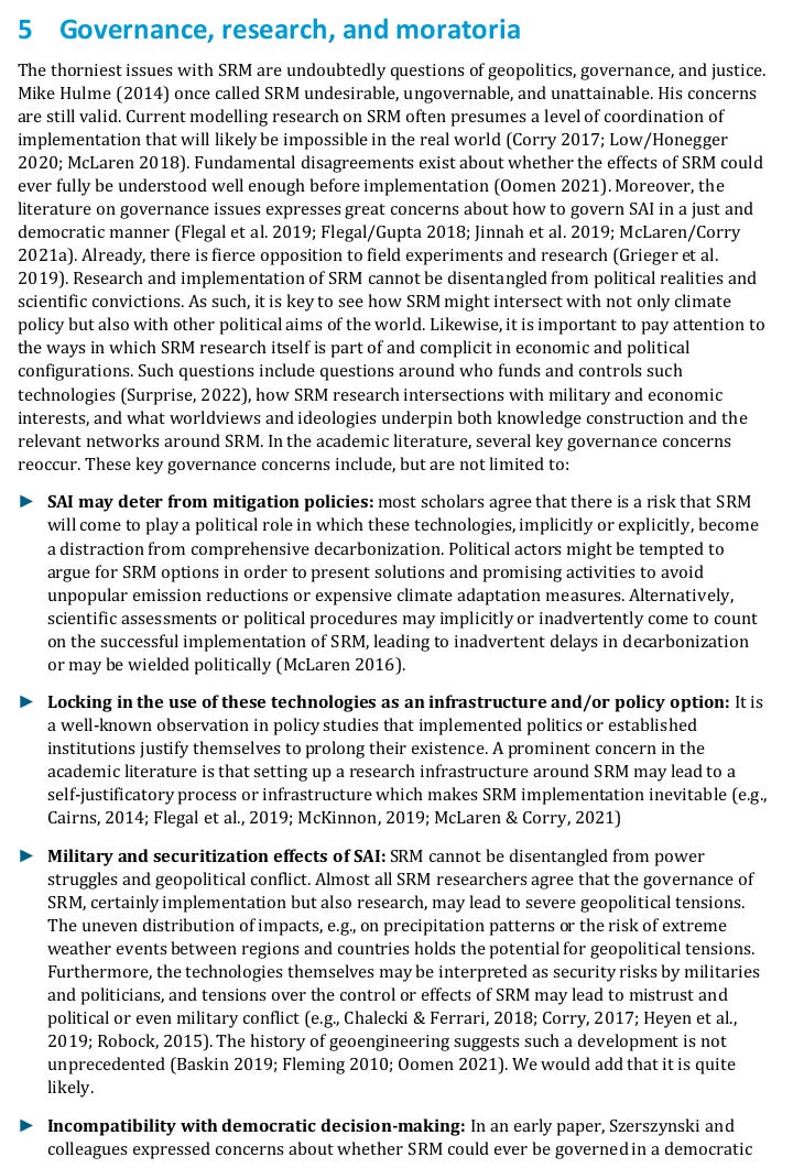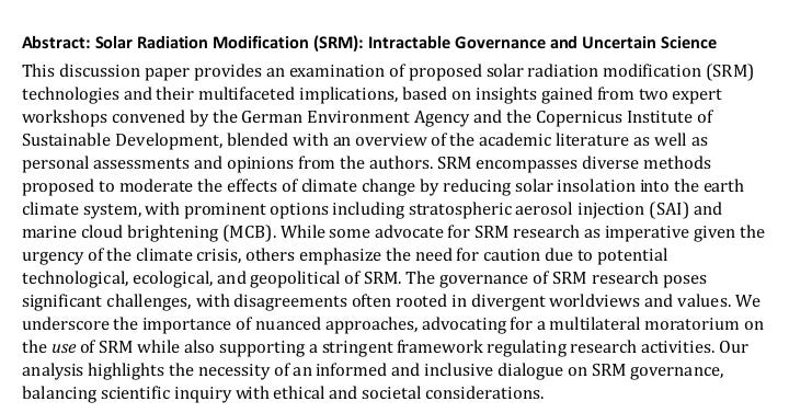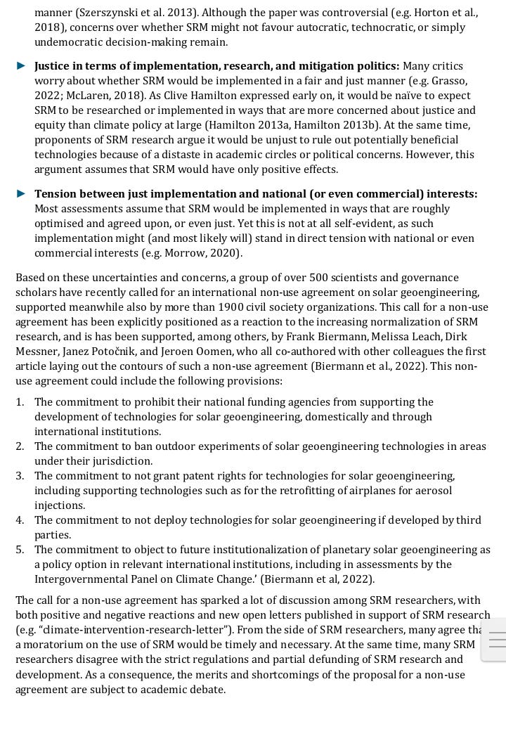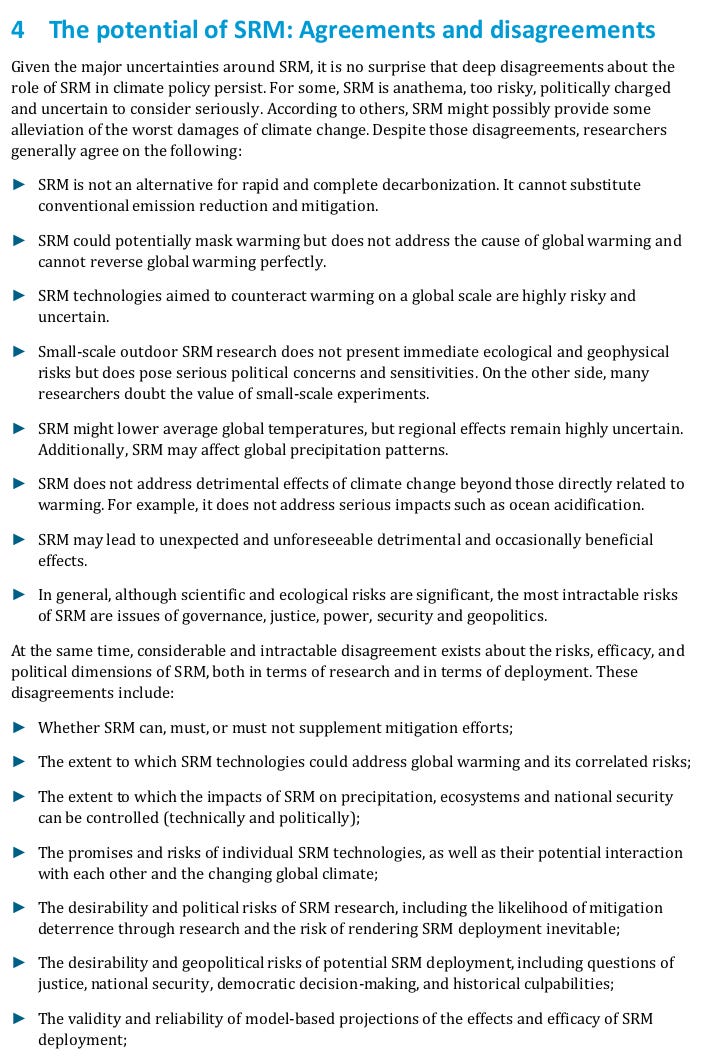 *April 2024* Solar radiation modification is highly controversial. The implementation of invasive geoengineering technologies would entail serious and largely unforeseeable ecological, and geopolitical risks. Considerable scientific disagreement exists around the extent of the risks, how they relate to increased risks of climate change, and whether uncertainties could be resolved. In expert workshops held in 2022 the scientific, technical, and geopolitical viability and desirability of SRM was discussed. This discussion paper presents a blended overview of the academic literature on solar geoengineering and the positions expressed at expert workshops, as well as personal assessments from the authors. <https://substackcdn.com/image/fetch/f_auto,q_auto:good,fl_progressive:steep/https%3A%2F%2Fsubstack-post-media.s3.amazonaws.com%2Fpublic%2Fimages%2F53d88f44-a193-46d8-98d5-a07b2b63aa16_720x1002.png> <https://substackcdn.com/image/fetch/f_auto,q_auto:good,fl_progressive:steep/https%3A%2F%2Fsubstack-post-media.s3.amazonaws.com%2Fpublic%2Fimages%2F5707f401-a4a1-484f-9693-de167de6b850_720x377.png> <https://substackcdn.com/image/fetch/f_auto,q_auto:good,fl_progressive:steep/https%3A%2F%2Fsubstack-post-media.s3.amazonaws.com%2Fpublic%2Fimages%2F0d066caa-401f-48fe-a505-af0311493945_720x1061.png> <https://substackcdn.com/image/fetch/f_auto,q_auto:good,fl_progressive:steep/https%3A%2F%2Fsubstack-post-media.s3.amazonaws.com%2Fpublic%2Fimages%2F916a6bae-fe05-4e30-8458-75671d040d57_720x1061.png> <https://substackcdn.com/image/fetch/f_auto,q_auto:good,fl_progressive:steep/https%3A%2F%2Fsubstack-post-media.s3.amazonaws.com%2Fpublic%2Fimages%2Fb042a995-d1c0-498b-b760-7c2a400d6d1e_720x1037.png> <https://substackcdn.com/image/fetch/f_auto,q_auto:good,fl_progressive:steep/https%3A%2F%2Fsubstack-post-media.s3.amazonaws.com%2Fpublic%2Fimages%2F564c5c63-bea4-49b9-87cc-604e06dbffed_720x644.png> <https://substackcdn.com/image/fetch/f_auto,q_auto:good,fl_progressive:steep/https%3A%2F%2Fsubstack-post-media.s3.amazonaws.com%2Fpublic%2Fimages%2Ff66d2532-b815-4d2d-b638-720d3282dd5c_720x914.png> *Source: German Environment Agency* -- You received this message because you are subscribed to the Google Groups "geoengineering" group. To unsubscribe from this group and stop receiving emails from it, send an email to [email protected]. To view this discussion on the web visit https://groups.google.com/d/msgid/geoengineering/CAHJsh98OT%3Dn-uX4vvi4XOaoVhPokz_RRaAP6%2BZRnqM8TH8xKiw%40mail.gmail.com.