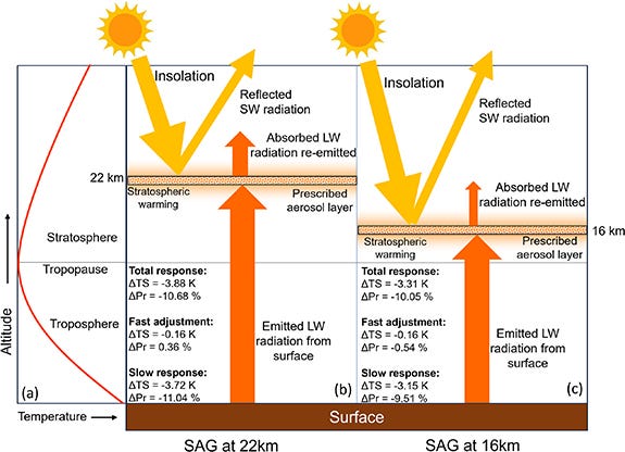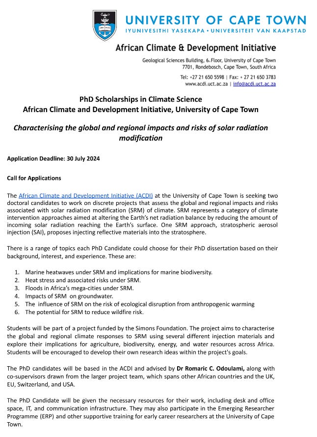*Subscribe to our newsletter to receive monthly updates on Solar Geoengineering:* Solar Geoengineering Updates <https://solargeoengineeringupdates.substack.com?utm_source=substack&utm_campaign=publication_embed&utm_medium=email> Monthly news summaries about solar geoengineering. Links to scientific papers, news articles, jobs, podcasts, and videos. <https://solargeoengineeringupdates.substack.com?utm_source=substack&utm_campaign=publication_embed&utm_medium=email> By Andrew Lockley <https://solargeoengineeringupdates.substack.com?utm_source=substack&utm_campaign=publication_embed&utm_medium=email> ------------------------------ *DEADLINES*(NEW) Registration Form for Virtual Workshops on Solar Radiation Modification: Science and Governance Perspectives for Africa by DSG <https://docs.google.com/forms/d/e/1FAIpQLScUgkVf6w1B_5hpTLAUc-C9lm3Kr_w_1yS_K8EN4xfGcY4UFw/viewform> | Registration Deadline: 25 July 2024*Call for Abstracts—AGU Conference | Submissions are open until 31 July 2024 <https://www.agu.org/annual-meeting>* *SRM Sessions at AGU2024:**GC009-Advances in Climate Engineering Science <https://agu.confex.com/agu/agu24/prelim.cgi/Session/227097>**A081-Exploring the Interplay of Weather Modification and Climate Intervention: Modeling, Observations, and Field Campaigns <https://agu.confex.com/agu/agu24/prelim.cgi/Session/230051>**GC004-Advancements in Climate Intervention Research Technologies, Policies and Practices: Opportunities and Issues <https://agu.confex.com/agu/agu24/prelim.cgi/Session/226893>**GC048-Climate Intervention, Mitigation, Adaptation, and Restoration: Assessing the Risks and Benefits of Using Earth System Models for Guidance on Climate Action <https://agu.confex.com/agu/agu24/prelim.cgi/Session/227971>* *Call for Abstract—Cloud and precipitation responses to aerosol pollution, weather modification and climate intervention <https://annual.ametsoc.org/index.cfm/2025/> | Deadline to apply: 15 August 2024**Funding opportunity: Modelling environmental responses to solar radiation management by Natural Environment Research Council (NERC) | Deadline to apply: 08 October 202 <https://www.ukri.org/opportunity/modelling-environmental-responses-to-solar-radiation-management/>4**Submit your recent research on Solar Radiation Management to new ES: Atmospheres collection <https://blogs.rsc.org/ea/2024/07/09/themed-collection-open-call-srm/?doing_wp_cron=1720638760.5584919452667236328125> | Deadline: 31 January 2025* ------------------------------ RESEARCH PAPERSWhy Conceptions of Scale Matter to Artificity Arguments in SRM Ethics <https://www.tandfonline.com/doi/full/10.1080/21550085.2024.2381417> Clark, C. J. (2024). Why Conceptions of Scale Matter to Artificity Arguments in SRM Ethics. *Ethics, Policy & Environment*, 1-13. *Abstract* Ethicists have raised a variety of concerns about solar radiation management (SRM). This essay investigates the specific worries associated with artificity: Does SRM transform the planet into an artifact? Should experimental SRM strategies be implemented if the consequences are unpredictable? These worries have led some to strongly reject SRM. But the conceptual framework used by environmental scientists to understand the scope of management interventions might offer a way to adequately defuse the perceived ethical concerns about artificity. Concepts from theories of scale, like discontinuity and panarchy, are discussed to demonstrate how the artificity arguments appear to depend on disputable premises. Sensitivity of the global hydrological cycle to the altitude of stratospheric sulphate aerosol layer <https://iopscience.iop.org/article/10.1088/1748-9326/ad5e9d/meta> KH, U., Bala, G., & Xavier, A. (2024). Sensitivity of the global hydrological cycle to the altitude of stratospheric sulphate aerosol layer. *Environmental Research Letters*. *Abstract* Stratospheric aerosol geoengineering (SAG) has been proposed as one of the potential options to offset the impacts of anthropogenically induced climate change. Previous modelling studies have shown that the efficacy of the cooling via SAG increases with altitude of the aerosol layer. It has been also shown that the stratospheric heating associated with SAG could stabilize the tropical atmosphere and weaken the tropical hydrological cycle. Using a global climate model, we perform a systematic study by prescribing volcanic sulphate aerosols at three different altitudes (22 km, 18 km and 16 km) and assess the sensitivity of the global and tropical mean precipitation to the altitude. We find that even though the efficacy of cooling increases with altitude of the aerosol layer, the global and tropical mean precipitation changes are less sensitive to the height of the aerosol layer. This is because the magnitude of both the global and tropical mean precipitation reduction increases with aerosol altitude in response to increasing efficacy of aerosols, but this sensitivity related to the slow response is nearly offset by the sensitivity of fast precipitation adjustments to aerosol altitude. A perspective and analysis based on atmospheric energy budget is presented to explain the lack of sensitivity of the hydrological cycle to the altitude of the stratospheric sulphate aerosol layer. Assessment of solar geoengineering impact on precipitation and temperature extremes in the Muda River Basin, Malaysia using CMIP6 SSP and GeoMIP6 G6 simulations <https://www.sciencedirect.com/science/article/abs/pii/S0048969724049660> Tan, M. L., Tew, Y. L., Liew, J., Bala, G., Tye, M. R., Chang, C. K., & Muhamad, N. (2024). Assessment of solar geoengineering impact on precipitation and temperature extremes in the Muda River Basin, Malaysia using CMIP6 SSP and GeoMIP6 G6 simulations. *Science of The Total Environment*, 174817. *Abstract* The concept of solar geoengineering remains a topic of debate, yet it may be an effective way for cooling the Earth's temperature. Nevertheless, the impact of solar geoengineering on regional 