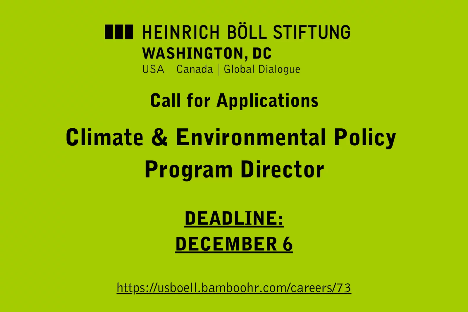 For those who are not familiar with Germany’s political foundations kindly be advised that in Germany every major political party that is represented in Germany’s national parliament („Bundestag“) is liaised with a publicly funded, legally independent, yet like-minded foundation that serves the primary purpose of political education. These foundations typcially also function as public policy think tanks with considerable research staff and it is also common for them to engage abroad and sustain overseas chapters. The Heinrich Boell Foundation was established in 1996 and is closely associated with Germany‘s Green Party. As it happens, one of HBF’s two co-chairs is Imme Scholz, whom many GEP-eders will know and who served as deputy director to our institute, IDOS – German Institute of Development and Sustainability until 2022. For the record, I am personally neither affiliated to the HBF nor to the Green Party, yet I do hold the HBF in high esteem and am therefore happy to share their job advert as included below. All the best Steffen Von: Carl from the Heinrich Böll Foundation, Washington, DC <[email protected]> Gesendet: Mittwoch, 13. November 2024 18:32 An: Bauer, Steffen <[email protected]> Betreff: Job Opening: Climate & Environmental Policy Program Director [https://files.crsend.com/229000/229745/images/Washington_EN_RGB%400%2C5x+CleverReach.png] ________________________________ [https://us.boell.org/sites/default/files/styles/var_larger/public/2024-11/climate-environmental-policy-cfa-rectangle.png.webp?itok=BY0rDLIc]<https://229745.seu2.cleverreach.com/c/100869476/f41a5b459519-smwgpd> ________________________________ Apply Now<https://229745.seu2.cleverreach.com/c/100869476/f41a5b459519-smwgpd> The Heinrich Böll Foundation, Washington, DC is welcoming applications for our Climate & Environmental Policy Program Director position. If you want to advance to green ideas in the fight against climate change, advocate for climate justice, and facilitate exchange on how to do so on both sides of the Atlantic, this job may be right for you. And if you know someone who might be a good fit, please share it with them! This role will include providing expert analysis, organizing workshops and study tours, and coordinating policy work and research. Like all of our work at the Heinrich Böll Foundation, Washington, DC, it has a strong emphasis on gender, racial, socioeconomic, and intergenerational justice. Applicants should apply with a cover letter, resume, and a writing sample of 1-5 pages via BambooHR<https://229745.seu2.cleverreach.com/c/100869476/f41a5b459519-smwgpd>. Applications must be submitted by December 6, 2024. For full information, including required and preferred qualifications, please check the job description on BambooHR<https://229745.seu2.cleverreach.com/c/100869476/f41a5b459519-smwgpd>. Apply Now<https://229745.seu2.cleverreach.com/c/100869476/f41a5b459519-smwgpd> ________________________________ If you wish to unsubscribe, click here<https://229745.seu2.cleverreach.com/c/100837098/f41a5b459519-smwgpd>. Heinrich-Böll-Stiftung Washington, DC 1432 K Street NW Washington, DC 20005 USA Web<https://229745.seu2.cleverreach.com/c/100837099/f41a5b459519-smwgpd>| Twitter<https://229745.seu2.cleverreach.com/c/100837100/f41a5b459519-smwgpd>| Facebook<https://229745.seu2.cleverreach.com/c/100837101/f41a5b459519-smwgpd>| Instagram<https://229745.seu2.cleverreach.com/c/100837102/f41a5b459519-smwgpd>| YouTube<https://229745.seu2.cleverreach.com/c/100837103/f41a5b459519-smwgpd> [email protected]<mailto:[email protected]> Your personal data is confidential and will not be forwarded to third parties according to our Privacy Policy<https://229745.seu2.cleverreach.com/c/100837104/f41a5b459519-smwgpd>. -- You received this message because you are subscribed to the Google Groups "gep-ed" group. To unsubscribe from this group and stop receiving emails from it, send an email to [email protected]. To view this discussion visit https://groups.google.com/d/msgid/gep-ed/aba90277949d4b68b53f43abe8083f2c%40idos-research.de.