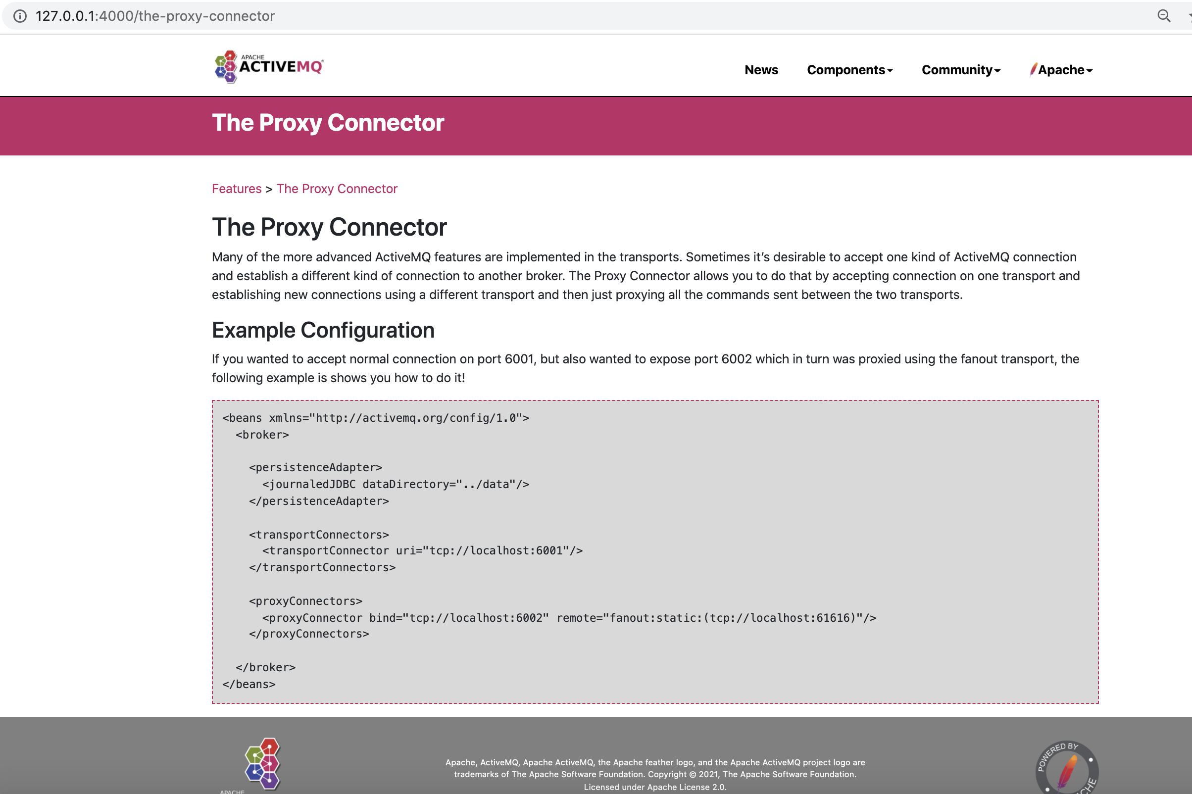 https://activemq.apache.org/the-proxy-connector is missing the example mentioned. The sample config exists in the markdown file but is not rendered properly.  -- This is an automated message from the Apache Git Service. To respond to the message, please log on to GitHub and use the URL above to go to the specific comment. To unsubscribe, e-mail: [email protected] For queries about this service, please contact Infrastructure at: [email protected]