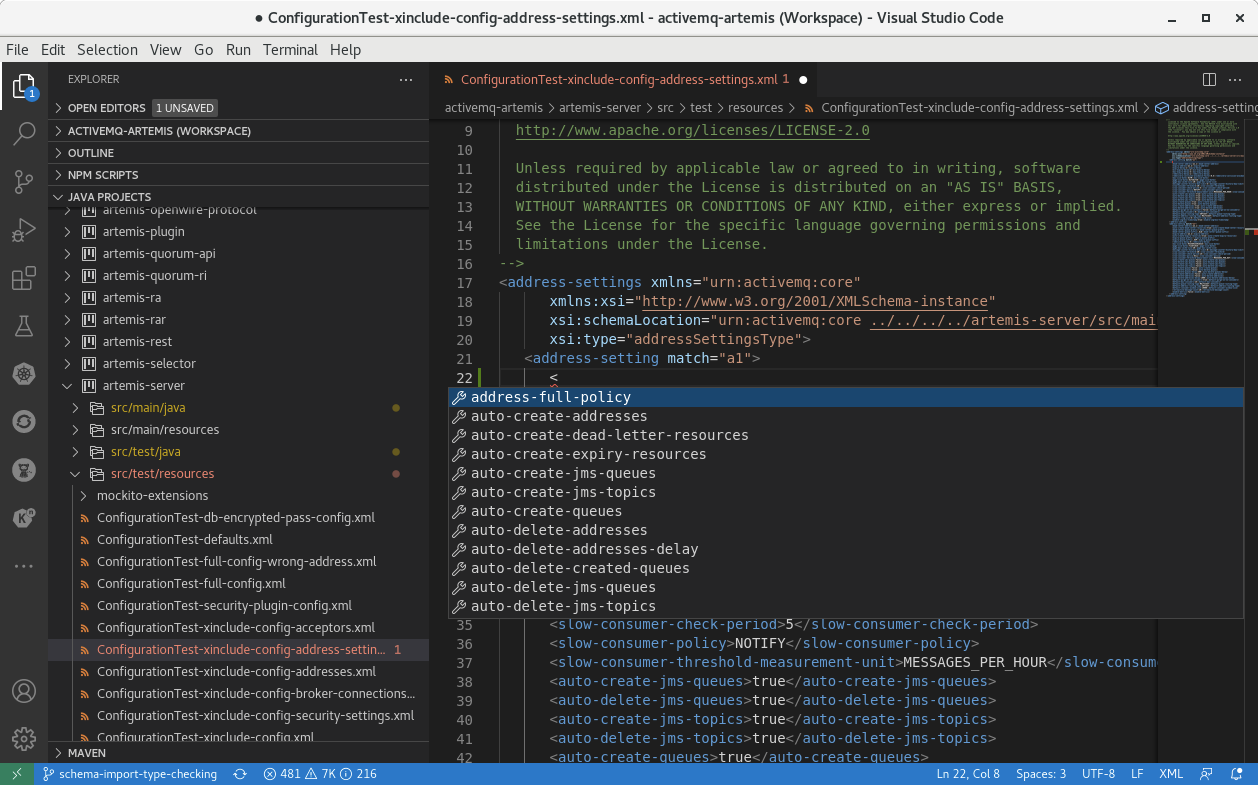 ########## artemis-server/src/main/resources/schema/artemis-configuration.xsd: ########## @@ -16,18 +16,23 @@ limitations under the License. Review Comment: If you would like me to replicate the original test files with an alternate modular include unit test scenario, I will do so. All the original test files work unaltered with the updated schema definition, as evidenced by the broker-connection and security-settings files. The existing config changes were to avoid creating a separate unit test class, which I will now create and submit. The attached screenshot shows one example of the IDE syntax support these schema definition changes enable when developing individual modular files, not just broker.xml files.  I would welcome other input here as well. -- This is an automated message from the Apache Git Service. To respond to the message, please log on to GitHub and use the URL above to go to the specific comment. To unsubscribe, e-mail: [email protected] For queries about this service, please contact Infrastructure at: [email protected]