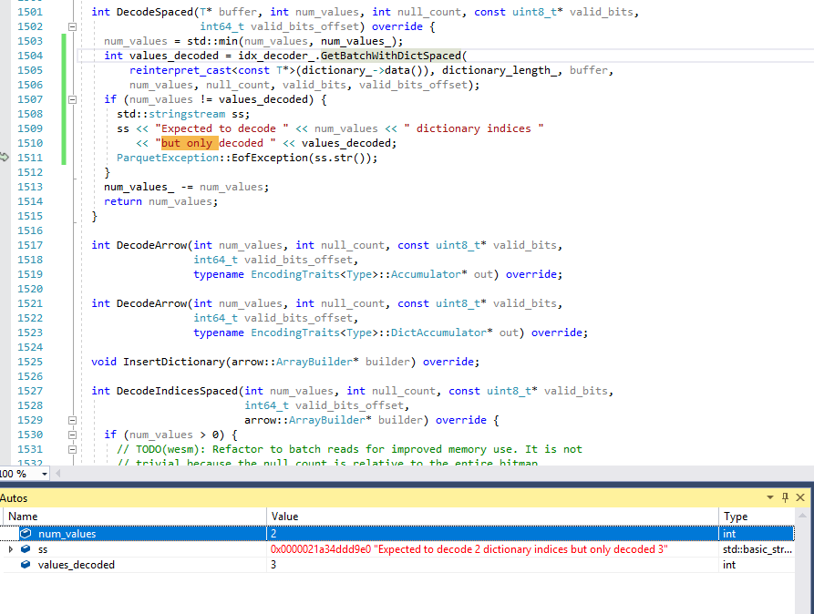 I'm able to reproduce the error in VS and set breakpoints, I got this far to see that GetBatchWithDictSpaced has decoded more values than it was asked to  ---------------------------------------------------------------- This is an automated message from the Apache Git Service. To respond to the message, please log on to GitHub and use the URL above to go to the specific comment. For queries about this service, please contact Infrastructure at: [email protected]