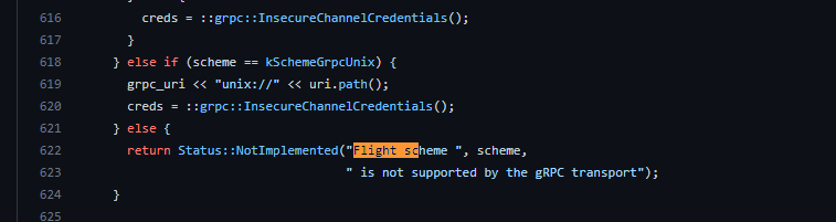 Great - thanks. Thinks it's now more a case of pointing users to where the docs are kept for that error. Suggest we add a link to the c++ transport not implemented message in  Link to file: https://github.com/apache/arrow/blob/6f9b07a41b50a6d2db37a28912ad22148453fc54/cpp/src/arrow/flight/transport/grpc/grpc_client.cc -- This is an automated message from the Apache Git Service. To respond to the message, please log on to GitHub and use the URL above to go to the specific comment. To unsubscribe, e-mail: [email protected] For queries about this service, please contact Infrastructure at: [email protected]