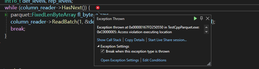 Thanks for your kindly reply. Here are my answers. 1. Sure. You can download it from [Google Drive](https://drive.google.com/file/d/1JHK6R1gvk_dbzWavUY_LZDJsOg7HAZZd/view?usp=share_link) and [One Drive](https://microsoftapc-my.sharepoint.com/:u:/g/personal/wenjiezhang_microsoft_com/EVfTkXxbbFlFiTQHmN_d2CgBpiesE58CESuLcL01Bo-jHw?e=bBh5Fk). 2. Sorry, I don't know what you mean. The details of access violation? All I can get is "Exception thrown at 0x00000167FD250550 in TestCppParquet.exe: 0xC0000005: Access violation executing location 0x00000167FD250550" in Visual Studio.  3. No. I cannot read the file without logical type in C#. My develop env list. 1. Visual Studio 2022 2. C++17 3. [ParquetSharp](https://github.com/G-Research/ParquetSharp) v8.0.0 4. arrow v10.0.0 -- This is an automated message from the Apache Git Service. To respond to the message, please log on to GitHub and use the URL above to go to the specific comment. To unsubscribe, e-mail: [email protected] For queries about this service, please contact Infrastructure at: [email protected]