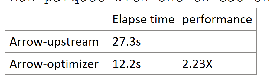 > Hi @zhixingheyi-tian, sorry this hasn't gotten reviewer attention for a while. Are you still interested in working on this? > > Would you mind rebasing and cleaning up any commented code? > > In addition, I noticed there aren't any benchmarks for binary or string types in either of these two benchmark files: > > * `src/parquet/arrow/reader_writer_benchmark.cc` > * `src/parquet/parquet_encoding_benchmark.cc` > > We'll want some benchmarks in order to evaluate the changes. If you add those, then you can compare benchmarks locally like so: > > ```shell > BUILD_DIR=cpp/path/to/build > > archery benchmark run $BUILD_DIR \ > --suite-filter=parquet-arrow-reader-writer-benchmark \ > --output=contender.json > > git checkout master # Or some ref that has benchmarks but not your changes > > archery benchmark run $BUILD_DIR \ > --suite-filter=parquet-arrow-reader-writer-benchmark \ > --output=baseline.json > > archery benchmark diff contender.json baseline.json > ``` Hi @wjones127 Good idea to show performance. How to add Binary/String benchmark in *benchmark.cc, I noticed currently Arrow benchmark testing had not support generating random binary data. In my local server end-2-end performance testing: `Generate one parquet file with dictionary-encoding (100M rows, 10 Cols) Run parquet with one thread on CentOS 7.6`  -- This is an automated message from the Apache Git Service. To respond to the message, please log on to GitHub and use the URL above to go to the specific comment. To unsubscribe, e-mail: [email protected] For queries about this service, please contact Infrastructure at: [email protected]