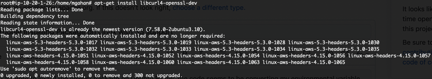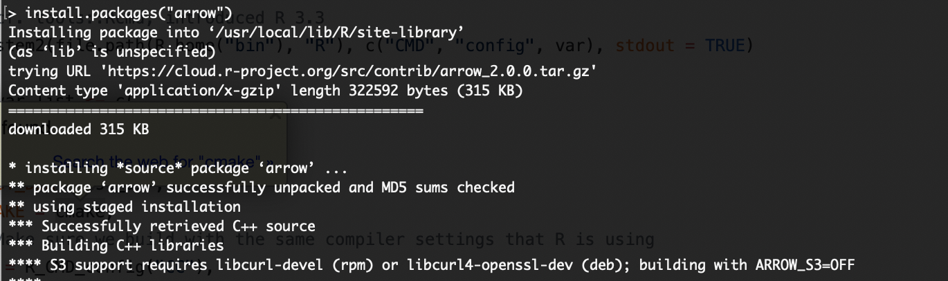 When I attempt to install the newest package on Ubuntu Bionic, the code seems to be converting my environmental variable `ARROW_S3=ON` to `ARROW_S3=OFF`.  The issue seems to be with the `libcurl4-openssl-dev` package, but I already have this package installed.  I am guessing that I am making a simple error, but curious if anyone else has come upon a similar issue with the install? Thanks for the great package, Mike ---------------------------------------------------------------- This is an automated message from the Apache Git Service. To respond to the message, please log on to GitHub and use the URL above to go to the specific comment. For queries about this service, please contact Infrastructure at: [email protected]