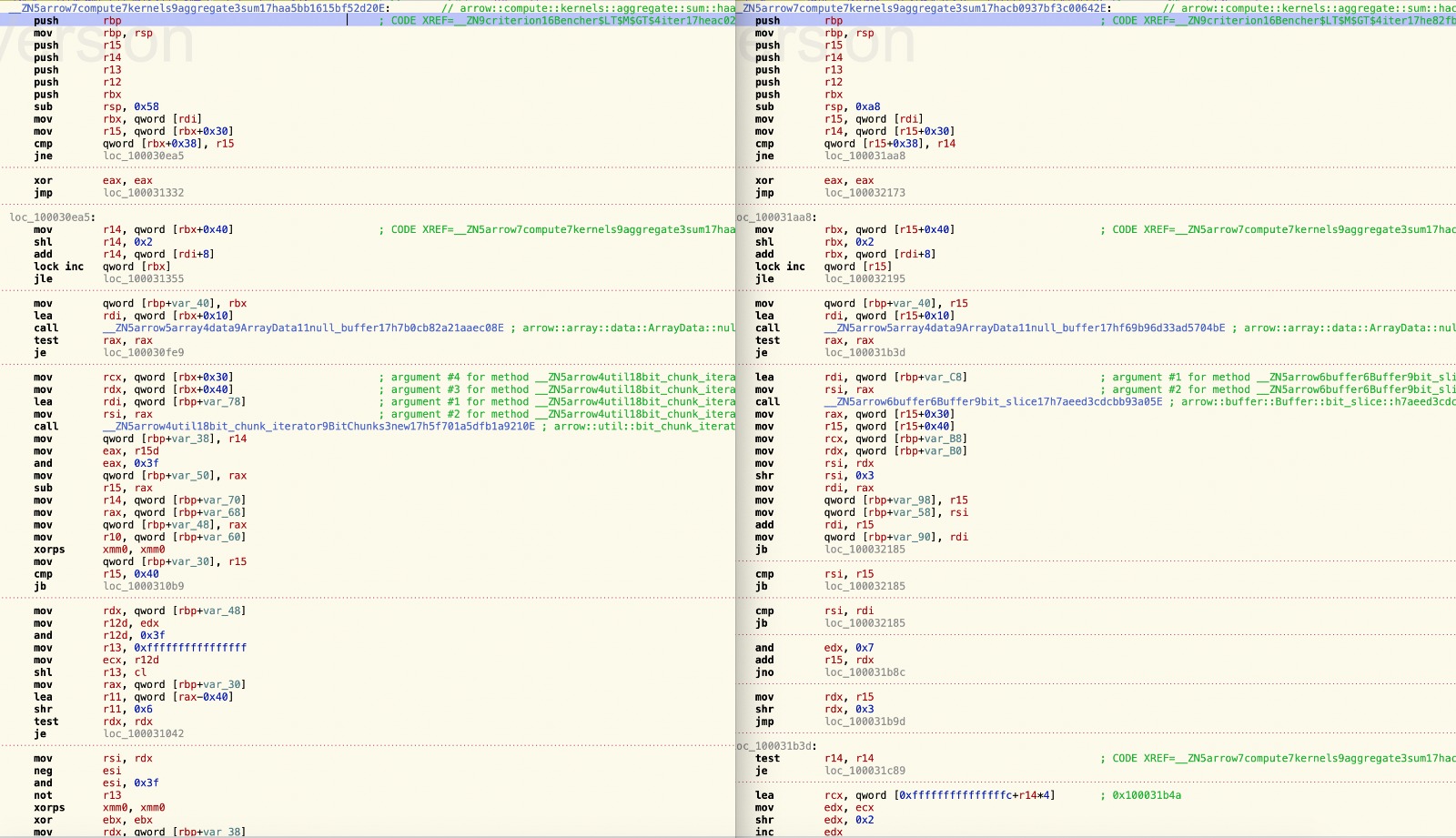 So, I have fixed all unreproducible benchmarks that we are running in #8635. Also open-sourced a benchmark utility https://github.com/vertexclique/zor to create always the same baseline for all people who runs `cargo bench` somehow. Running master with reproducible benches and doing the same for this PR gives these results: https://gist.github.com/vertexclique/b5860ad836e78044d331cd3bb93fcf20 So far this PR is giving a boost to many operations. > I think we should address jhorstmann 's measurements of performance regressions before this pR is merged. I measured the performance. :upside_down_face: It is in the PR description. > I'm going to look at what the reason for the perf regressions is, during the week in my evenings. I haven't been able to profile criterion benchmarks with the tool that I use (https://superluminal.eu/), so I'll write some small application(s) so I can get the perf profiles for this. Would be nice! I have used the perf counters, and disasm so far and didn't see anything except bounds checks and proper alignment checks. Attached left is the master's code right is this pr. Mind that left doesn't jump to remainder checks because it is erased by const prop in remainder bits that I have applied with https://github.com/apache/arrow/commit/7696b89e68637ea1c54ef806a095a18ea7b2936f#diff-4eec3bf3d3993d5a6a7fa0b6a0b057dc5b517b7737eb47e00a887e7a3dcb1c37R65  > @vertexclique @jorgecarleitao there's been work on Java and C++ to support big-endian architectures; so maybe we can check in on previous mailing list discussions for guidance. I think CI might be the main concern (incl for arm-v7 support). Definitely, I will start a thread tomorrow. Also opened: https://github.com/apache/arrow/pull/8634 ---------------------------------------------------------------- This is an automated message from the Apache Git Service. To respond to the message, please log on to GitHub and use the URL above to go to the specific comment. For queries about this service, please contact Infrastructure at: [email protected]