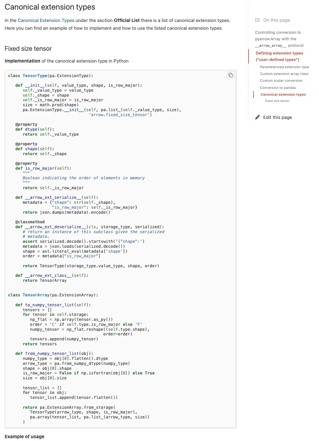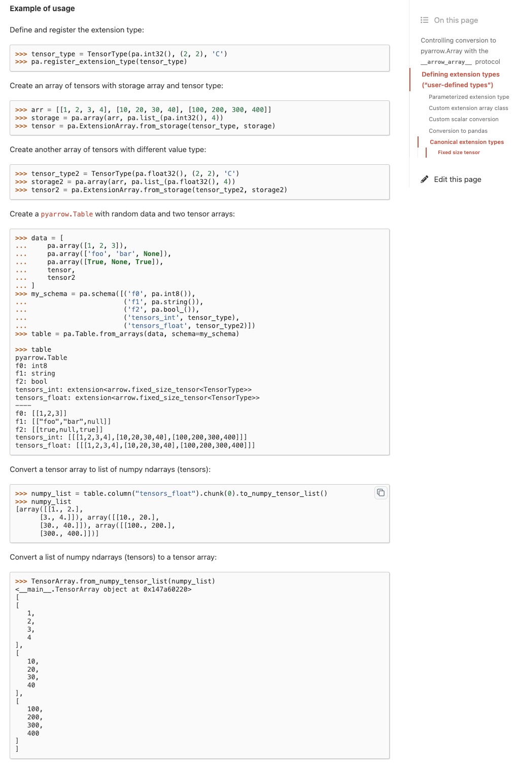### Rationale for this change There have been quite a lot of discussions connected to the tensor support in Arrow Tables/RecorBatches. This PR is a Python implementation example for the specification proposal to add tensors as a canonical type extensions which will be sent to the Mailing list for discussion and vote. ### What changes are included in this PR? - Implementation of the fixed size tensor canonical extension type in PyArrow plus tests (as an example in test_extension_type.py) - Example of the implementation and example of the usage in `pyarrow.Table` (added to extending_types.rst) ### Are these changes tested? - Tests for the implementation are added to test_extension_type.py - html version of the example in the documentation:   ### Are there any user-facing changes? No. -- This is an automated message from the Apache Git Service. To respond to the message, please log on to GitHub and use the URL above to go to the specific comment. To unsubscribe, e-mail: [email protected] For queries about this service, please contact Infrastructure at: [email protected]