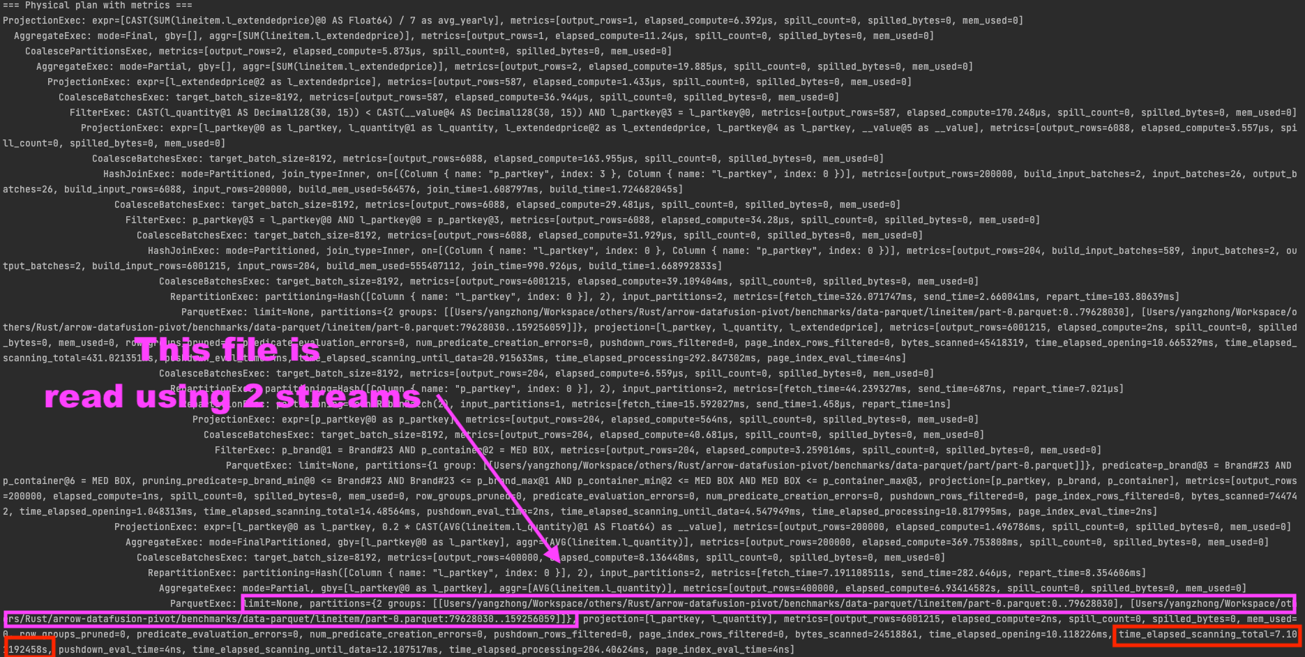 For anyone else following along the original PR that added this change was https://github.com/apache/arrow-datafusion/pull/5020 @yahoNanJing -- looking at the screen shot you provided,  It looks to me like the parquet file in question is being read using 2 streams (aka the file was opened by two different tasks which are reading it in parallel) Thus while the wall clock time takes only 4 seconds it may be possible that the total cpu time is actually 7 seconds You could potentially disable the `repartition_file_scans` option https://docs.rs/datafusion/latest/datafusion/config/struct.OptimizerOptions.html#structfield.repartition_file_scans And see if the metrics were more like what you expected Perhaps @thinkharderdev or @tustvold have additional thoughts they could share -- This is an automated message from the Apache Git Service. To respond to the message, please log on to GitHub and use the URL above to go to the specific comment. To unsubscribe, e-mail: [email protected] For queries about this service, please contact Infrastructure at: [email protected]