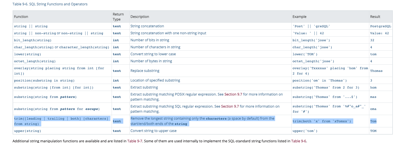 I agree with @seddonm1 that ideally we would follow Postgres when possible so we can just re-use all their documentation and semantics and so we don't end up inadvertently creating yet another SQL dialect like spark. Specifically in this case, it looks like the relevant postgres function is called `TRIM`. A screen shot from https://www.postgresql.org/docs/9.1/functions-string.html  ---------------------------------------------------------------- This is an automated message from the Apache Git Service. To respond to the message, please log on to GitHub and use the URL above to go to the specific comment. For queries about this service, please contact Infrastructure at: [email protected]