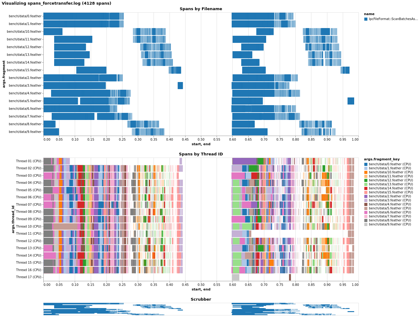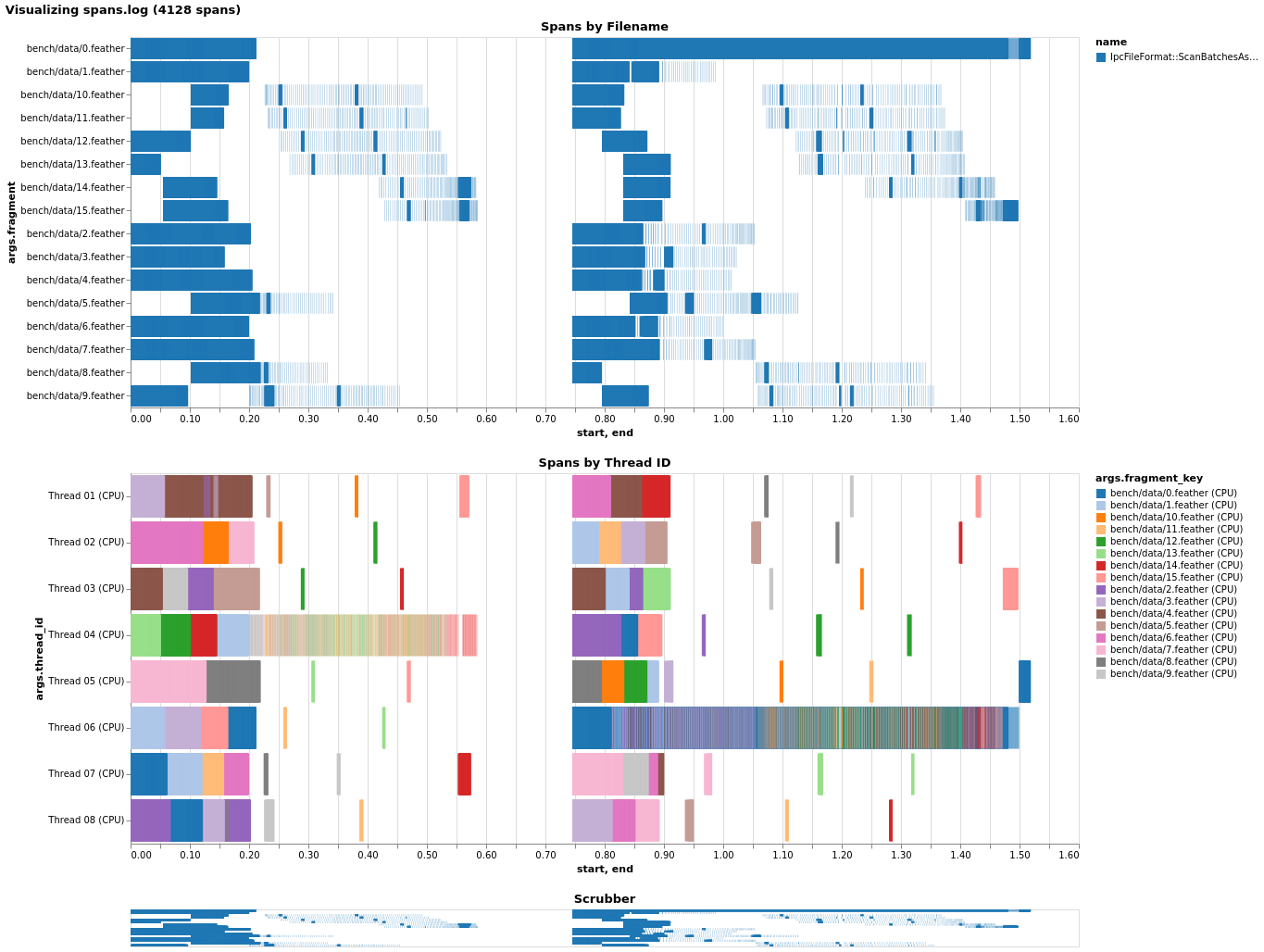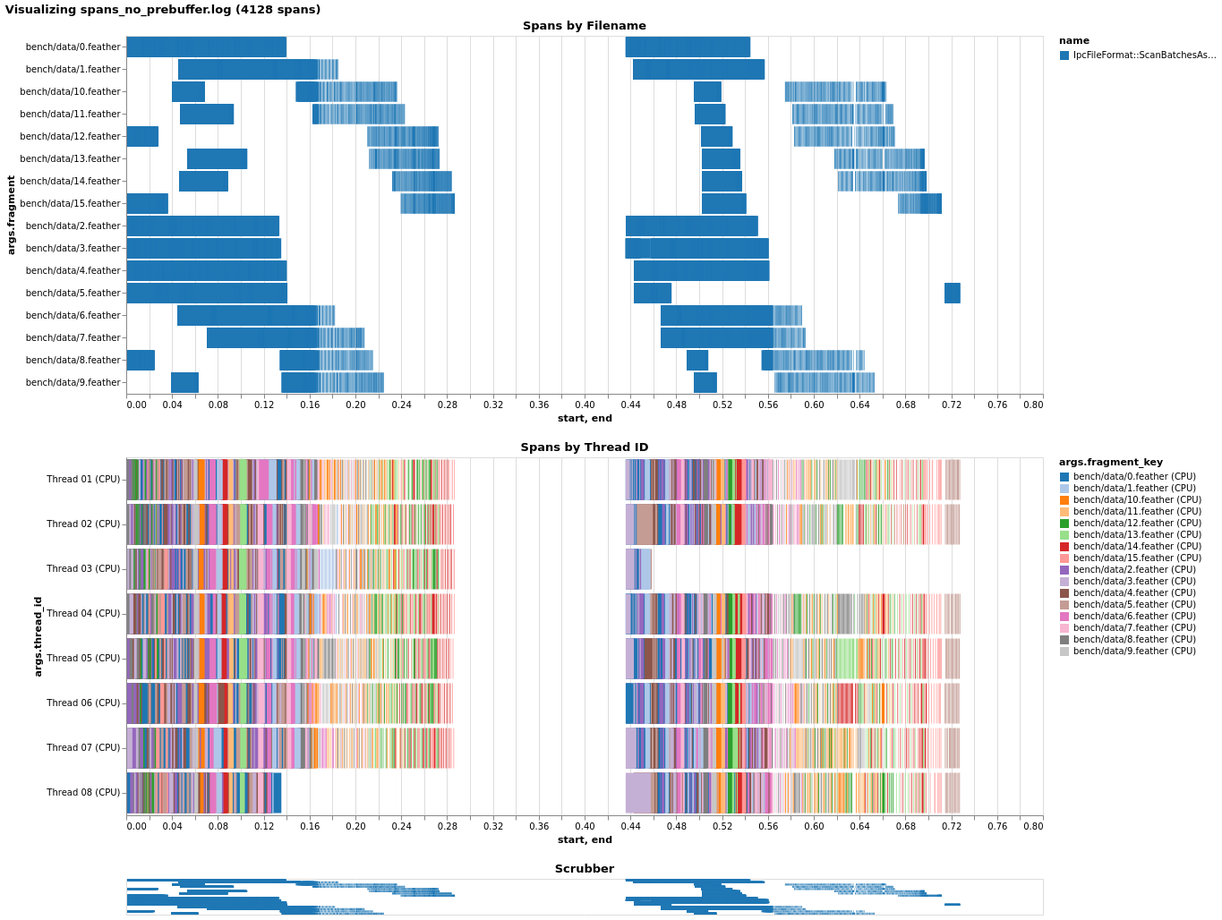 I instrumented a bit of the scanner and took a look at pre-buffering's effect on local file performance, to see if I could figure out why it seems detrimental. Without pre-buffering locally, we're utilizing the CPU thread pool (nearly) fully. (I'm not sure why one thread seems to receive little/no work, but I didn't fully instrument the scanner and perhaps it's assembling the table or something like that.)  Just enabling pre-buffer causes a slowdown, as it appears nearly all work gets forced onto a single thread!  Before I saw that transferring the CPU task helped with this, and indeed, it does, though it doesn't quite get us on par. Also note I had to change the code to _force_ transfer by callling `Spawn` instead of just using `Transfer`.  Given this, I'd guess what happens is as follows: with coalescing, since multiple record batches get mapped onto one I/O future, later requests to read a record batch will find an already-completed Future and will synchronously run all the callbacks inline, causing everything to pile onto the main thread. Forcing transfer alleviates this and better utilizes the thread pool, but the CPU-bound tasks are very fast (<< 1ms) and so we face the overhead of creating extra futures/spawning tasks instead. (Note that the non-pre-buffer case probably isn't even touching the CPU thread pool, because we don't transfer in that case - that's why you only see 16 threads (8 I/O + 8 CPU) in the last case.) -- This is an automated message from the Apache Git Service. To respond to the message, please log on to GitHub and use the URL above to go to the specific comment. For queries about this service, please contact Infrastructure at: [email protected]