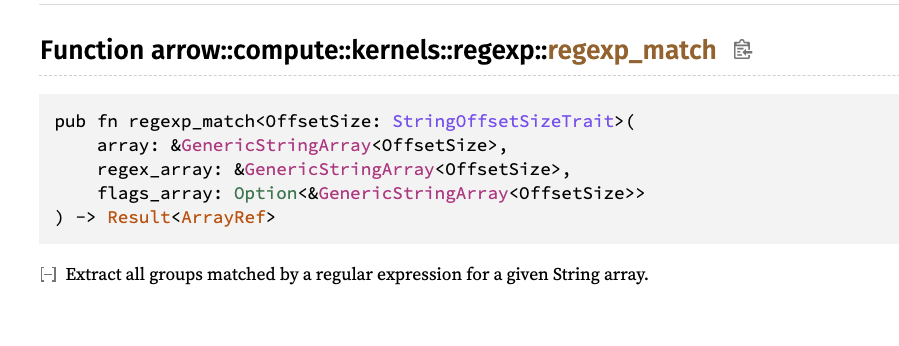 **Is your feature request related to a problem or challenge? Please describe what you are trying to do.** The current documentation for the `regexp_match` kernel is quite sparse: https://docs.rs/arrow/5.2.0/arrow/compute/kernels/regexp/fn.regexp_match.html  Also, since this function returns `ArrayRef` (aka untyped generic Array), I was personally a bit confused that `regexp_match` actually returns a `ListArray` with the matches. Having this documented would help a lot. **Describe the solution you'd like** 1. A description of the type of the array that is returned 2. A doc example (can probably adapt a test in the code) that shows how to invoke `regexp_match` and use the returned `ListArray` -- This is an automated message from the Apache Git Service. To respond to the message, please log on to GitHub and use the URL above to go to the specific comment. To unsubscribe, e-mail: [email protected] For queries about this service, please contact Infrastructure at: [email protected]