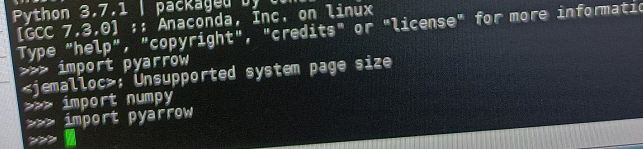 enviroment:arm64 aarch64 python: anaconda2 python3.7 when i use this command(import pyarrow ) and i get a error(unsupported system page size) How to solve this problem?  -- This is an automated message from the Apache Git Service. To respond to the message, please log on to GitHub and use the URL above to go to the specific comment. To unsubscribe, e-mail: [email protected] For queries about this service, please contact Infrastructure at: [email protected]