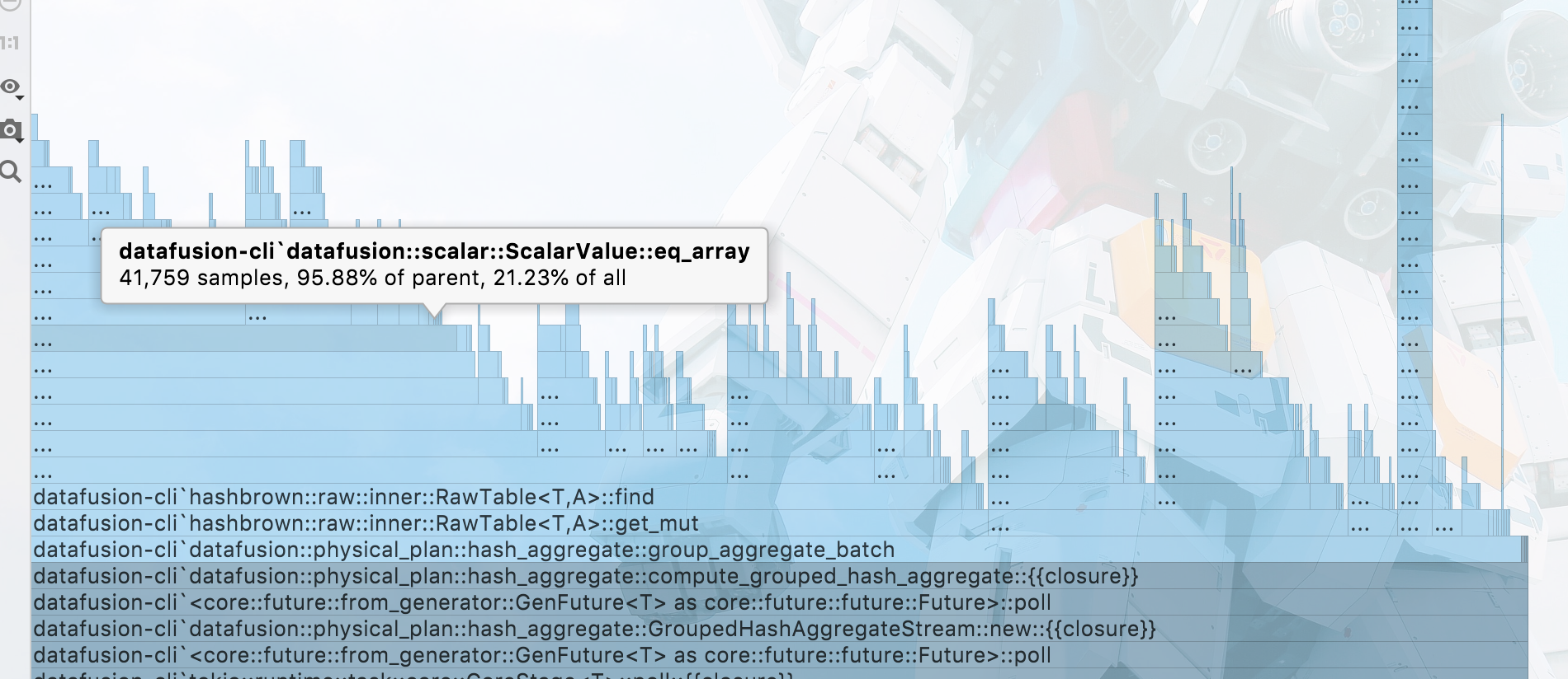 **Is your feature request related to a problem or challenge? Please describe what you are trying to do.** Related issue #1246 #956 Part of the high-cardinality aggregation performance problem can be solved in arrow2. But currently `eq_array` still takes a lot of time. https://github.com/apache/arrow-datafusion/blob/6478a33c705fc7fdf28ec141685b447a6619ec08/datafusion/src/physical_plan/hash_aggregate.rs#L375-L389 View in pprof   **Describe the solution you'd like** Optimize the performance of eq_array **Describe alternatives you've considered** A clear and concise description of any alternative solutions or features you've considered. **Additional context** Add any other context or screenshots about the feature request here. -- This is an automated message from the Apache Git Service. To respond to the message, please log on to GitHub and use the URL above to go to the specific comment. To unsubscribe, e-mail: [email protected] For queries about this service, please contact Infrastructure at: [email protected]