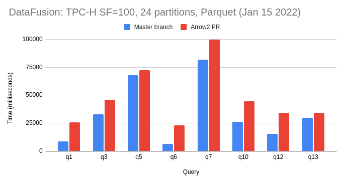 Here are some quick benchmark results comparing the master branch and this PR, running on a threadripper desktop with 24 cores and an NVMe drive. I ran each query once only. These are the commands that I ran: ``` cargo build --release cd benchmarks cargo run --release --bin tpch -- benchmark datafusion --iterations 1 --path /mnt/bigdata/tpch/sf100-24part-parquet --format parquet --query 13 --batch-size 4096 --partitions 24 ```  Queries 1 and 6 were both at least 3x slower and query 12 was more than 2x slower. I used the following commits: Master: 1c39f5ce865e3e1225b4895196073be560a93e82 Arrow2: e53d165f018a54d47f80ff2a132f83cee363c79c I will poke around a bit myself this weekend and see if I can debug this based on metrics to try and determine where the performance issues are. -- This is an automated message from the Apache Git Service. To respond to the message, please log on to GitHub and use the URL above to go to the specific comment. To unsubscribe, e-mail: [email protected] For queries about this service, please contact Infrastructure at: [email protected]