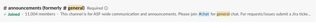 @bullet03 Since ASF #general was renamed to #announcements "Don’t ask Beam questions in #general. We don’t monitor it." looks like not applicable anymore. Propose that we remove this sentence.  -- This is an automated message from the Apache Git Service. To respond to the message, please log on to GitHub and use the URL above to go to the specific comment. To unsubscribe, e-mail: [email protected] For queries about this service, please contact Infrastructure at: [email protected]