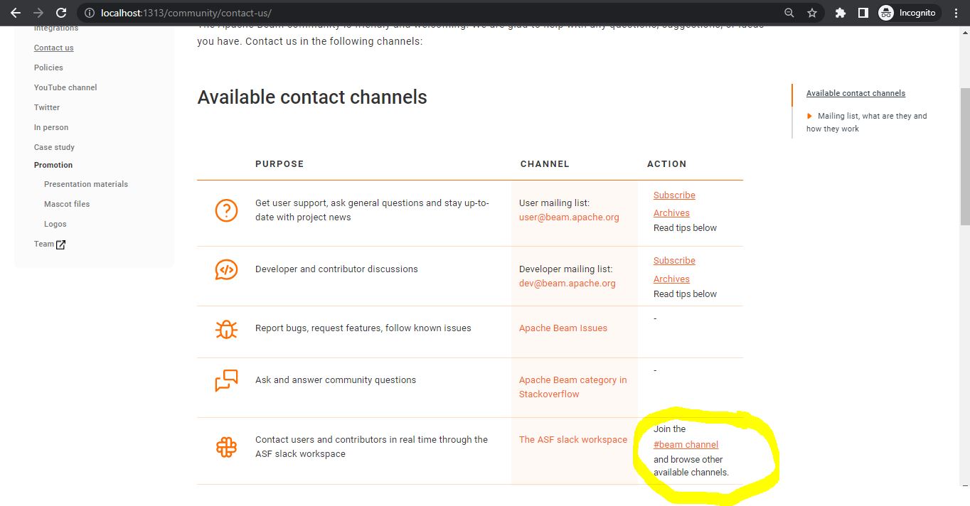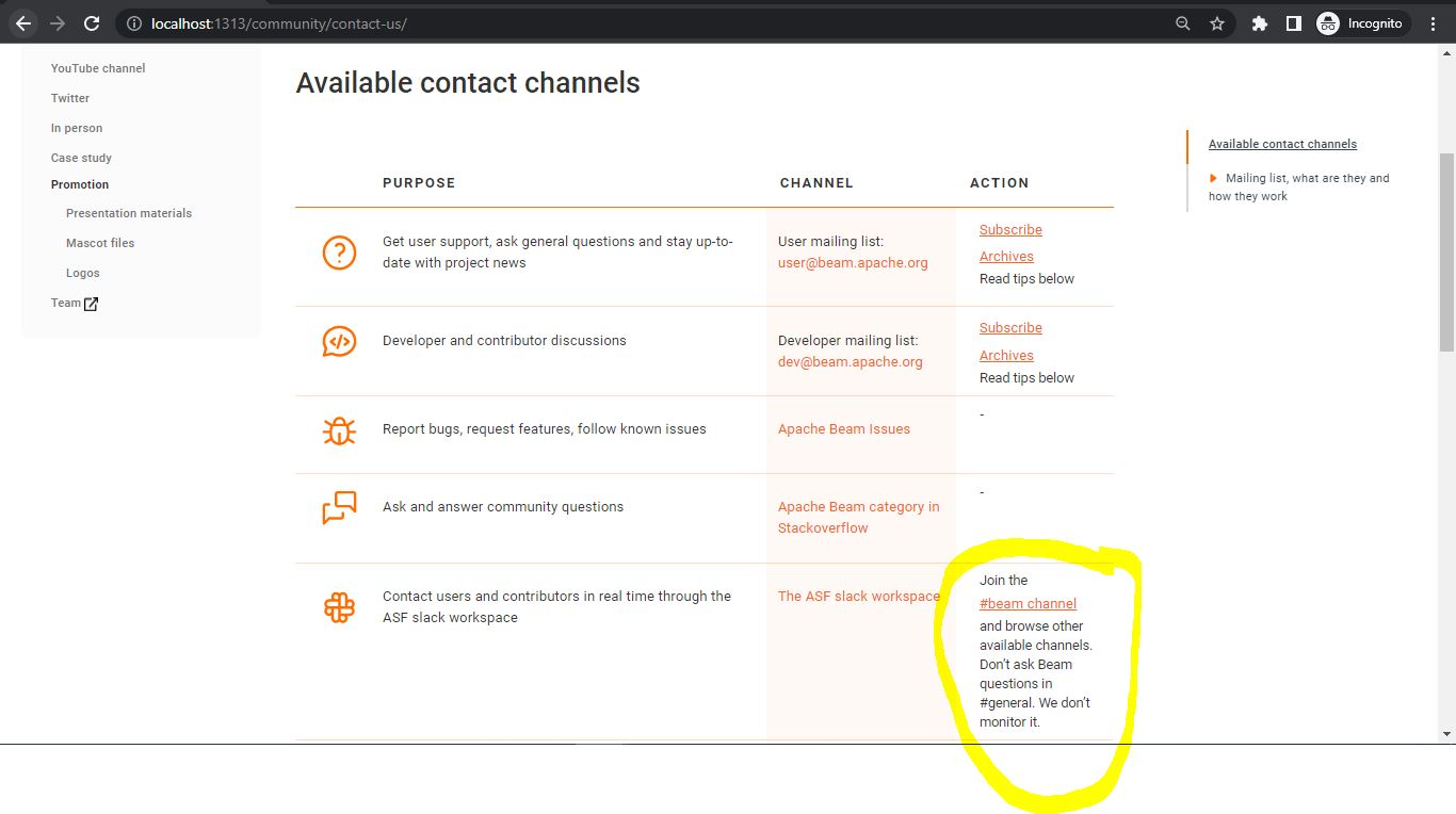 Resolves #22696 - remove text from Available contact channels table ________________________________________________________________________________________________________________________________ before:  after:  ------------------------ Thank you for your contribution! Follow this checklist to help us incorporate your contribution quickly and easily: - [ ] [**Choose reviewer(s)**](https://beam.apache.org/contribute/#make-your-change) and mention them in a comment (`R: @username`). - [ ] Mention the appropriate issue in your description (for example: `addresses #123`), if applicable. This will automatically add a link to the pull request in the issue. If you would like the issue to automatically close on merging the pull request, comment `fixes #<ISSUE NUMBER>` instead. - [ ] Update `CHANGES.md` with noteworthy changes. - [ ] If this contribution is large, please file an Apache [Individual Contributor License Agreement](https://www.apache.org/licenses/icla.pdf). See the [Contributor Guide](https://beam.apache.org/contribute) for more tips on [how to make review process smoother](https://beam.apache.org/contribute/get-started-contributing/#make-the-reviewers-job-easier). To check the build health, please visit [https://github.com/apache/beam/blob/master/.test-infra/BUILD_STATUS.md](https://github.com/apache/beam/blob/master/.test-infra/BUILD_STATUS.md) GitHub Actions Tests Status (on master branch) ------------------------------------------------------------------------------------------------ [](https://github.com/apache/beam/actions?query=workflow%3A%22Build+python+source+distribution+and+wheels%22+branch%3Amaster+event%3Aschedule) [](https://github.com/apache/beam/actions?query=workflow%3A%22Python+Tests%22+branch%3Amaster+event%3Aschedule) [](https://github.com/apache/beam/actions?query=workflow%3A%22Java+Tests%22+branch%3Amaster+event%3Aschedule) [](https://github.com/apache/beam/actions?query=workflow%3A%22Go+tests%22+branch%3Amaster+event%3Aschedule) See [CI.md](https://github.com/apache/beam/blob/master/CI.md) for more information about GitHub Actions CI. -- This is an automated message from the Apache Git Service. To respond to the message, please log on to GitHub and use the URL above to go to the specific comment. To unsubscribe, e-mail: [email protected] For queries about this service, please contact Infrastructure at: [email protected]