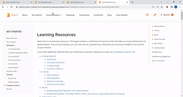 ########## website/www/site/layouts/partials/section-menu/en/get-started.html: ########## @@ -37,16 +38,16 @@ <span class="section-nav-list-title">Learning resources</span> <ul class="section-nav-list"> - <li><a href="/documentation/resources/learning-resources/#getting-started">Getting Started</a></li> Review Comment: Thank you for your point. Added an aliases to learning-resources.md, so now there is a redirect to correct path /get-started/resources/learning-resources even in case somebody uses /documentation/resources/learning-resources, so there will be no 404 error in case of old web search or others.  -- This is an automated message from the Apache Git Service. To respond to the message, please log on to GitHub and use the URL above to go to the specific comment. To unsubscribe, e-mail: [email protected] For queries about this service, please contact Infrastructure at: [email protected]