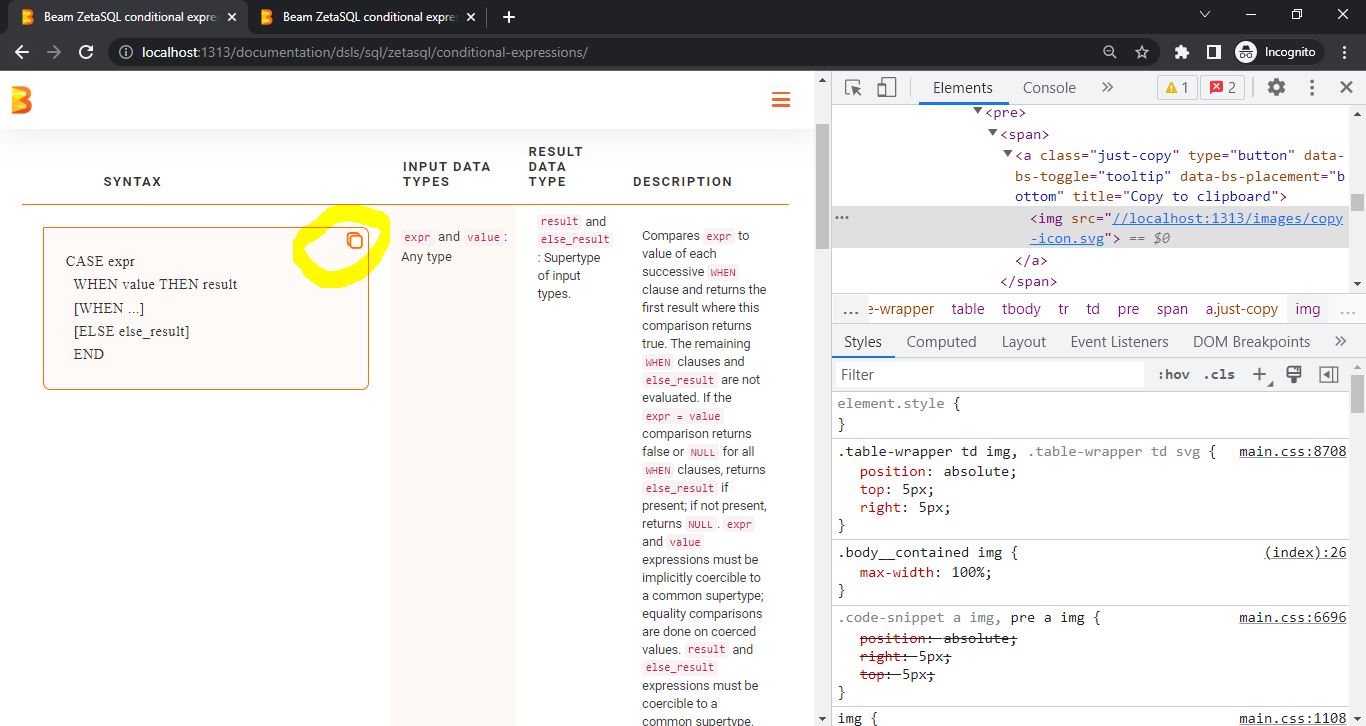 - update positioning of copy icon in tables to the right top corner ------------------------ before:  after:  ------------------------ Thank you for your contribution! Follow this checklist to help us incorporate your contribution quickly and easily: - [ ] [**Choose reviewer(s)**](https://beam.apache.org/contribute/#make-your-change) and mention them in a comment (`R: @username`). - [ ] Mention the appropriate issue in your description (for example: `addresses #123`), if applicable. This will automatically add a link to the pull request in the issue. If you would like the issue to automatically close on merging the pull request, comment `fixes #<ISSUE NUMBER>` instead. - [ ] Update `CHANGES.md` with noteworthy changes. - [ ] If this contribution is large, please file an Apache [Individual Contributor License Agreement](https://www.apache.org/licenses/icla.pdf). See the [Contributor Guide](https://beam.apache.org/contribute) for more tips on [how to make review process smoother](https://beam.apache.org/contribute/get-started-contributing/#make-the-reviewers-job-easier). To check the build health, please visit [https://github.com/apache/beam/blob/master/.test-infra/BUILD_STATUS.md](https://github.com/apache/beam/blob/master/.test-infra/BUILD_STATUS.md) GitHub Actions Tests Status (on master branch) ------------------------------------------------------------------------------------------------ [](https://github.com/apache/beam/actions?query=workflow%3A%22Build+python+source+distribution+and+wheels%22+branch%3Amaster+event%3Aschedule) [](https://github.com/apache/beam/actions?query=workflow%3A%22Python+Tests%22+branch%3Amaster+event%3Aschedule) [](https://github.com/apache/beam/actions?query=workflow%3A%22Java+Tests%22+branch%3Amaster+event%3Aschedule) [](https://github.com/apache/beam/actions?query=workflow%3A%22Go+tests%22+branch%3Amaster+event%3Aschedule) See [CI.md](https://github.com/apache/beam/blob/master/CI.md) for more information about GitHub Actions CI. -- This is an automated message from the Apache Git Service. To respond to the message, please log on to GitHub and use the URL above to go to the specific comment. To unsubscribe, e-mail: [email protected] For queries about this service, please contact Infrastructure at: [email protected]
