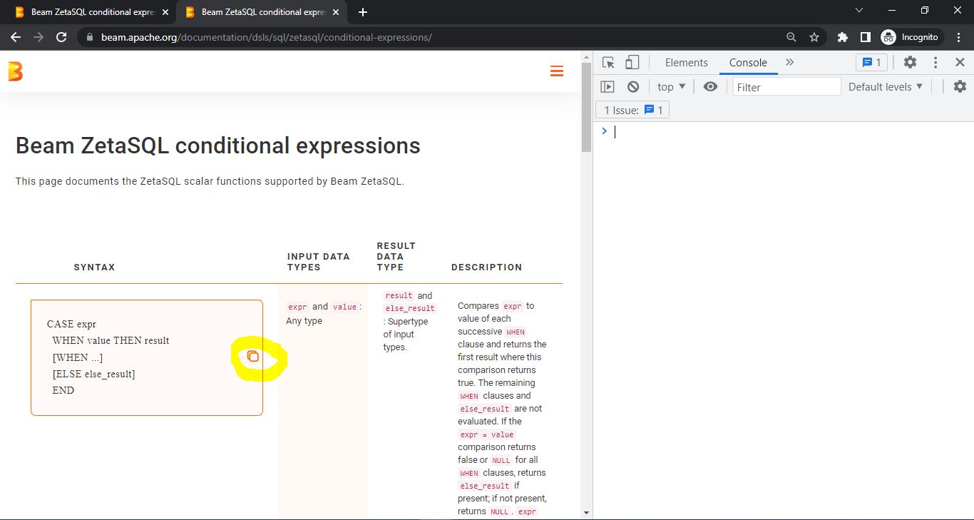 ### What happened? Steps to reproduce: 1. Open (Beam ZetaSQL conditional expressions)[https://beam.apache.org/documentation/dsls/sql/zetasql/conditional-expressions/] in the browser 2. Go to the section `This page documents the ZetaSQL scalar functions supported by Beam ZetaSQL` 3. Take a look on the copy icon position Actual result: icon is centered Expected result: icon is located in the right top corner  ### Issue Priority Priority: 3 ### Issue Component Component: website -- This is an automated message from the Apache Git Service. To respond to the message, please log on to GitHub and use the URL above to go to the specific comment. To unsubscribe, e-mail: [email protected] For queries about this service, please contact Infrastructure at: [email protected]