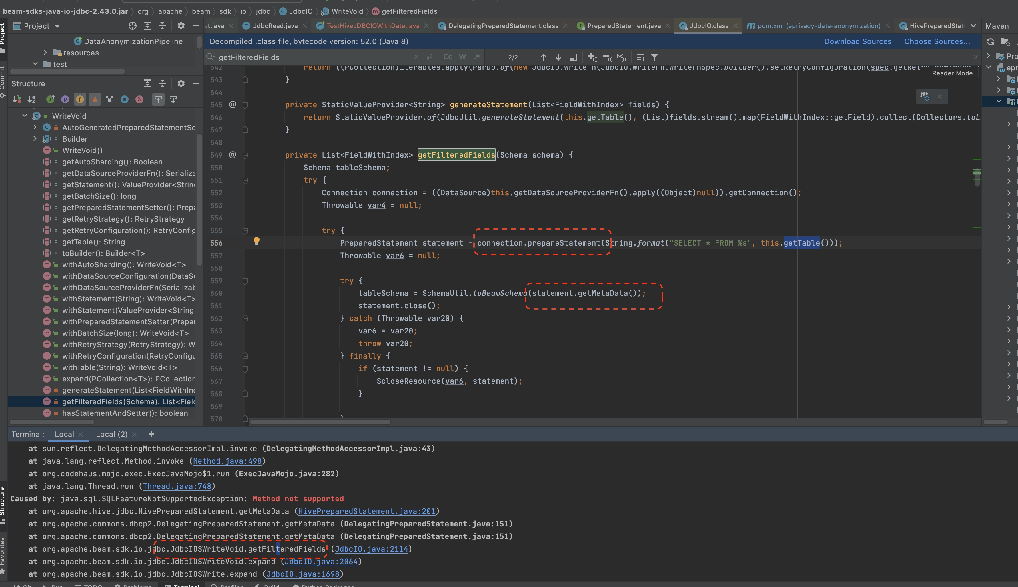 at org.apache.beam.sdk.io.jdbc.JdbcIO$WriteVoid.getFilteredFields