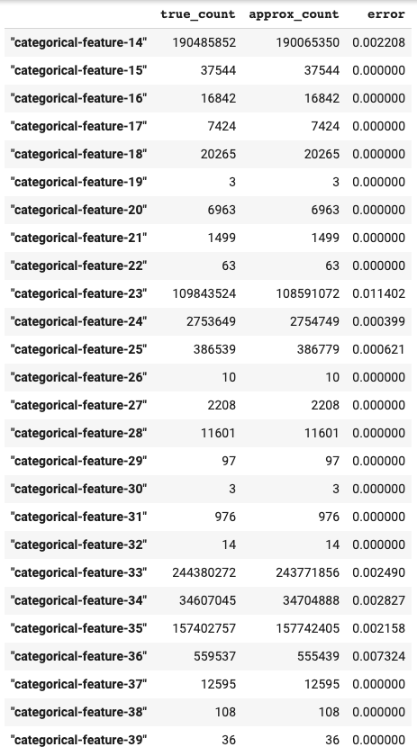 Also, here are the accuracy stats for the hashlib md5 fingerprint for a dataset with 3B examples with expected error set to 0.01:  ---------------------------------------------------------------- This is an automated message from the Apache Git Service. To respond to the message, please log on to GitHub and use the URL above to go to the specific comment. For queries about this service, please contact Infrastructure at: [email protected]