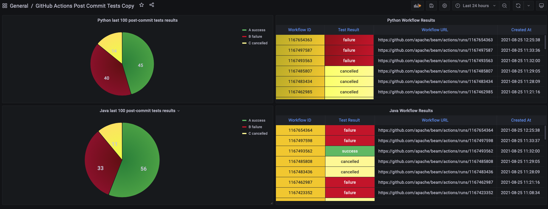 This PR is comprised of the changes required to graph the results of the GAs tests which run against the Apache Beam repository. Below is a screenshot of how the dashboard looks.  The data being shown is pulled by Grafana (via a plugin) from the GitHub REST API. The plugin ([JSON API](https://grafana.com/grafana/plugins/marcusolsson-json-datasource/)) is setup in the .test-infra/metrics/docker-compose.yml file. R: Hi Ahmet @aaltay ! Can you please take a look at this PR? ------------------------ Thank you for your contribution! Follow this checklist to help us incorporate your contribution quickly and easily: - [ x] [**Choose reviewer(s)**](https://beam.apache.org/contribute/#make-your-change) and mention them in a comment (`R: @username`). - [ x] Format the pull request title like `[BEAM-XXX] Fixes bug in ApproximateQuantiles`, where you replace `BEAM-XXX` with the appropriate JIRA issue, if applicable. This will automatically link the pull request to the issue. - [ ] Update `CHANGES.md` with noteworthy changes. - [ ] If this contribution is large, please file an Apache [Individual Contributor License Agreement](https://www.apache.org/licenses/icla.pdf). See the [Contributor Guide](https://beam.apache.org/contribute) for more tips on [how to make review process smoother](https://beam.apache.org/contribute/#make-reviewers-job-easier). `ValidatesRunner` compliance status (on master branch) -------------------------------------------------------- <table> <thead> <tr> <th>Lang</th> <th>ULR</th> <th>Dataflow</th> <th>Flink</th> <th>Samza</th> <th>Spark</th> <th>Twister2</th> </tr> </thead> <tbody> <tr> <td>Go</td> <td>---</td> <td> <a href="https://ci-beam.apache.org/job/beam_PostCommit_Go/lastCompletedBuild/"> <img alt="Build Status" src="https://ci-beam.apache.org/job/beam_PostCommit_Go/lastCompletedBuild/badge/icon"> </a> <td> <a href="https://ci-beam.apache.org/job/beam_PostCommit_Go_VR_Flink/lastCompletedBuild/"> <img alt="Build Status" src="https://ci-beam.apache.org/job/beam_PostCommit_Go_VR_Flink/lastCompletedBuild/badge/icon"> </a> </td> <td> <a href="https://ci-beam.apache.org/job/beam_PostCommit_Go_VR_Samza/lastCompletedBuild/"> <img alt="Build Status" src="https://ci-beam.apache.org/job/beam_PostCommit_Go_VR_Samza/lastCompletedBuild/badge/icon"> </a> </td> <td> <a href="https://ci-beam.apache.org/job/beam_PostCommit_Go_VR_Spark/lastCompletedBuild/"> <img alt="Build Status" src="https://ci-beam.apache.org/job/beam_PostCommit_Go_VR_Spark/lastCompletedBuild/badge/icon"> </a> </td> <td>---</td> </tr> <tr> <td>Java</td> <td> <a href="https://ci-beam.apache.org/job/beam_PostCommit_Java_ValidatesRunner_ULR/lastCompletedBuild/"> <img alt="Build Status" src="https://ci-beam.apache.org/job/beam_PostCommit_Java_ValidatesRunner_ULR/lastCompletedBuild/badge/icon"> </a> </td> <td> <a href="https://ci-beam.apache.org/job/beam_PostCommit_Java_ValidatesRunner_Dataflow/lastCompletedBuild/"> <img alt="Build Status" src="https://ci-beam.apache.org/job/beam_PostCommit_Java_ValidatesRunner_Dataflow/lastCompletedBuild/badge/icon?subject=V1"> </a><br> <a href="https://ci-beam.apache.org/job/beam_PostCommit_Java_ValidatesRunner_Dataflow_Streaming/lastCompletedBuild/"> <img alt="Build Status" src="https://ci-beam.apache.org/job/beam_PostCommit_Java_ValidatesRunner_Dataflow_Streaming/lastCompletedBuild/badge/icon?subject=V1+Streaming"> </a><br> <a href="https://ci-beam.apache.org/job/beam_PostCommit_Java_ValidatesRunner_Dataflow_Java11/lastCompletedBuild/"> <img alt="Build Status" src="https://ci-beam.apache.org/job/beam_PostCommit_Java_ValidatesRunner_Dataflow_Java11/lastCompletedBuild/badge/icon?subject=V1+Java+11"> </a><br> <a href="https://ci-beam.apache.org/job/beam_PostCommit_Java_VR_Dataflow_V2/lastCompletedBuild/"> <img alt="Build Status" src="https://ci-beam.apache.org/job/beam_PostCommit_Java_VR_Dataflow_V2/lastCompletedBuild/badge/icon?subject=V2"> </a><br> <a href="https://ci-beam.apache.org/job/beam_PostCommit_Java_VR_Dataflow_V2_Streaming/lastCompletedBuild/"> <img alt="Build Status" src="https://ci-beam.apache.org/job/beam_PostCommit_Java_VR_Dataflow_V2_Streaming/lastCompletedBuild/badge/icon?subject=V2+Streaming"> </a><br> </td> <td> <a href="https://ci-beam.apache.org/job/beam_PostCommit_Java_ValidatesRunner_Flink/lastCompletedBuild/"> <img alt="Build Status" src="https://ci-beam.apache.org/job/beam_PostCommit_Java_ValidatesRunner_Flink/lastCompletedBuild/badge/icon?subject=Java+8"> </a><br> <a href="https://ci-beam.apache.org/job/beam_PostCommit_Java_ValidatesRunner_Flink_Java11/lastCompletedBuild/"> <img alt="Build Status" src="https://ci-beam.apache.org/job/beam_PostCommit_Java_ValidatesRunner_Flink_Java11/lastCompletedBuild/badge/icon?subject=Java+11"> </a><br> <a href="https://ci-beam.apache.org/job/beam_PostCommit_Java_PVR_Flink_Batch/lastCompletedBuild/"> <img alt="Build Status" src="https://ci-beam.apache.org/job/beam_PostCommit_Java_PVR_Flink_Batch/lastCompletedBuild/badge/icon?subject=Portable"> </a><br> <a href="https://ci-beam.apache.org/job/beam_PostCommit_Java_PVR_Flink_Streaming/lastCompletedBuild/"> <img alt="Build Status" src="https://ci-beam.apache.org/job/beam_PostCommit_Java_PVR_Flink_Streaming/lastCompletedBuild/badge/icon?subject=Portable+Streaming"> </a> </td> <td> <a href="https://ci-beam.apache.org/job/beam_PostCommit_Java_ValidatesRunner_Samza/lastCompletedBuild/"> <img alt="Build Status" src="https://ci-beam.apache.org/job/beam_PostCommit_Java_ValidatesRunner_Samza/lastCompletedBuild/badge/icon"> </a><br> <a href="https://ci-beam.apache.org/job/beam_PostCommit_Java_PVR_Samza/lastCompletedBuild/"> <img alt="Build Status" src="https://ci-beam.apache.org/job/beam_PostCommit_Java_PVR_Samza/lastCompletedBuild/badge/icon?subject=Portable"> </a> </td> <td> <a href="https://ci-beam.apache.org/job/beam_PostCommit_Java_ValidatesRunner_Spark/lastCompletedBuild/"> <img alt="Build Status" src="https://ci-beam.apache.org/job/beam_PostCommit_Java_ValidatesRunner_Spark/lastCompl