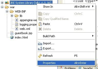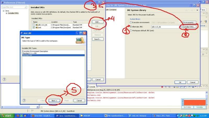 what U need is following this 1. Right click on JRE System Library , and chose properties (http://i61.photobucket.com/albums/h79/hc_reborn/Step1.jpg) 2. Follow the number (http://i61.photobucket.com/albums/h79/hc_reborn/Step2.jpg) note: ignore the word "JDK [version]" lol because i made this after i finish. 3.Follow the number (again) until u can found your JDK directory (http://i61.photobucket.com/albums/h79/hc_reborn/Step3.jpg) 4.Klik Finish , and change alternate Jre into ur new what U add. For U who have problem is where is " /sign" ?? the step is easy u must change ur web.xml into like this (http://i61.photobucket.com/albums/h79/hc_reborn/Step4.jpg) for web.xml like that U can found in ( [your directory] appengine-java- sdk\demos\guestbook\war\WEB-INF). Note don't forget the name MUST SAME... --Fin--- i hope this can help other people. On Aug 24, 8:51 am, Rajeev Dayal <[email protected]> wrote: > Hi, > You can't add a JDK by adding the JDK's bin path to your classpath. What you > need to do is go into the Java Build Path dialog, and select the "JRE System > Library" entry. Then, click "Edit". A dialog will pop up, giving you the > option to select an alternate JRE. However, you probably have not registered > the JDK you downloaded with Eclipse, so you'll have to click on the > "Installed JREs" button. You'll be presented with another dialog where > you'll be able to add your JDK, then when you go back to the previous > dialog, you can choose the JDK that you just installed. > > Let me know if you run into any trouble. > > Rajeev > > On Mon, Aug 24, 2009 at 7:58 AM, HC <[email protected]> wrote: > > > Can U explain with picture step by step ? Sorry i have try ur > > instruction > > > " By right clicking either on the error in the Problems tab or > > by right clicking on the project in the package explorer, find Build > > path. I don't know if the next step was necessary, but under Java > > Build Path, I included a new folder and mapped a new folder to my jdk > > [version]/bin folder. Then under Libraries if you click on JRE System > > Library and then select Edit on the right, you will then be presented > > with the option of using an Alternate JRE, which is where I was able > > to select jdk[version]. " > > > i try adding JDK > >http://i61.photobucket.com/albums/h79/hc_reborn/hah.jpg > > > but still the white cross in the red box didn't went away @.@ > > > THX. --~--~---------~--~----~------------~-------~--~----~ You received this message because you are subscribed to the Google Groups "Google App Engine for Java" group. To post to this group, send email to [email protected] To unsubscribe from this group, send email to [email protected] For more options, visit this group at http://groups.google.com/group/google-appengine-java?hl=en -~----------~----~----~----~------~----~------~--~---