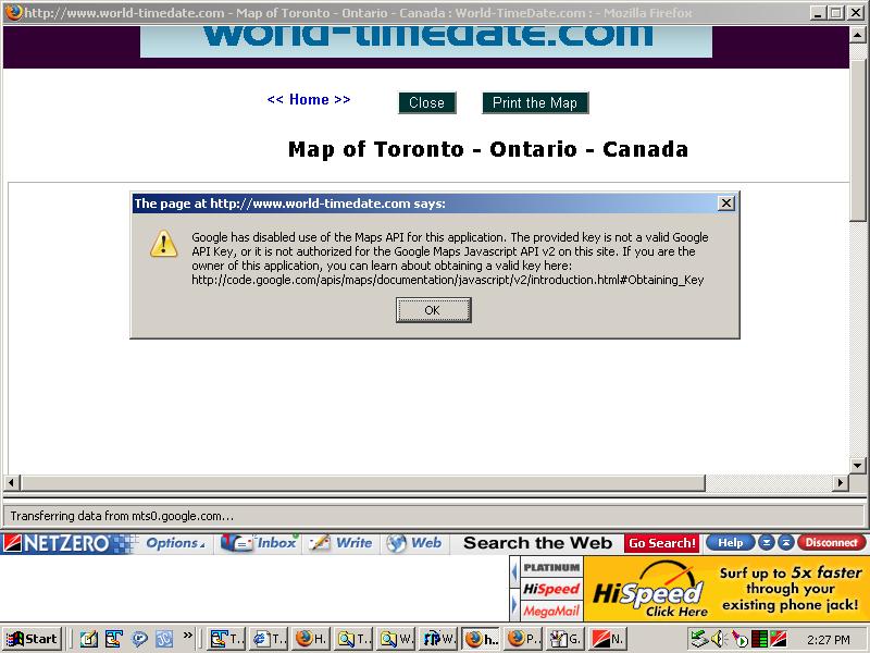 I am getting the following message : http://www.world-timedate.com/maps/Google_MAP_Error.jpg Can someone show me how to resolve problem ? To access Toronto City Map, Please visit the following page Toronto Time : http://www.world-timedate.com/worldclock/current_time.php?city_id=5 Then click on the link "Tornoto Map" I appreciate your help. S. Das ( http://www.world-timedate.com/ ) -- You received this message because you are subscribed to the Google Groups "Google Maps API V2" group. To post to this group, send email to [email protected]. To unsubscribe from this group, send email to [email protected]. For more options, visit this group at http://groups.google.com/group/google-maps-api?hl=en.