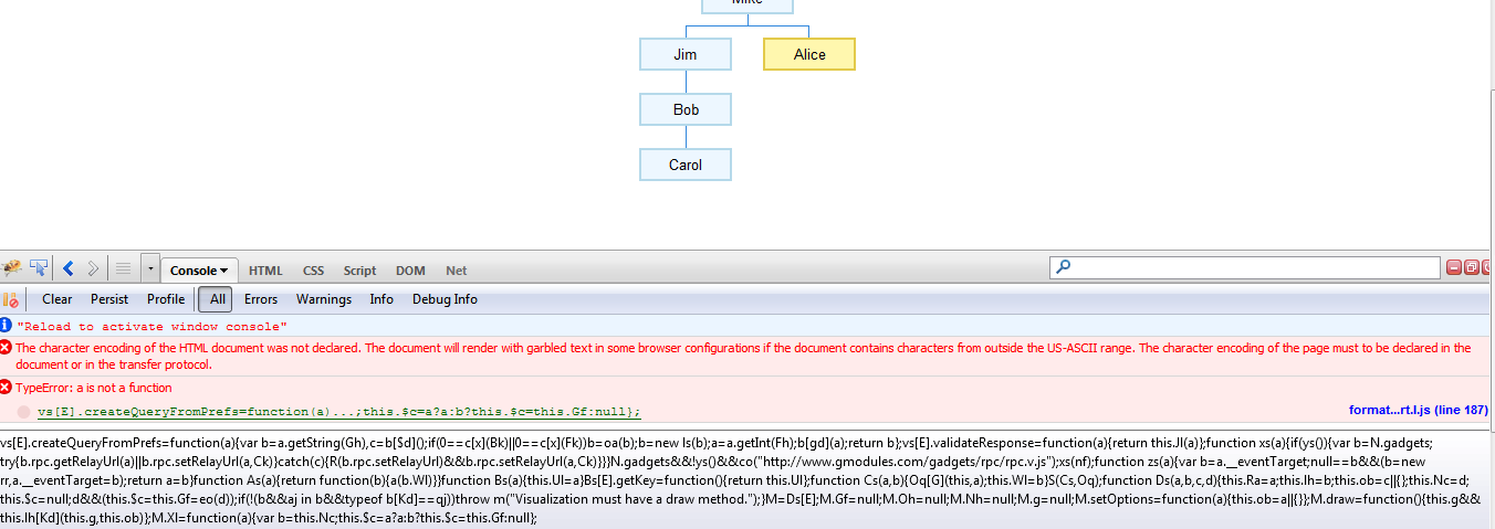 <https://lh6.googleusercontent.com/-8oXMzK52Y9g/Ul5pGfz22dI/AAAAAAAAAAM/nWiL_qz_iGE/s1600/Error+msg+from+firebug.PNG> Any idea what is causing this error? here is the source code that produces it: <html> <head> <script type='text/javascript' src='https://www.google.com/jsapi'></script> <script type='text/javascript'> google.load('visualization', '1', {packages:['orgchart']}); google.setOnLoadCallback(drawChart); function drawChart() { data = new google.visualization.DataTable(); data.addColumn('string', 'Name'); data.addColumn('string', 'Manager'); data.addColumn('string', 'ToolTip'); data.addRows([ ['Mike', '', 'The President'], ['Jim', 'Mike', ''], ['Alice', 'Mike', ''], ['Bob', 'Jim', 'Bob Sponge'], ['Carol', 'Bob', ''] ]); chart = new google.visualization.OrgChart(document.getElementById('chart_div')); chart.draw(data, {allowHtml:true}); google.visualization.events.addListener(chart, 'select', selectHandler()); } function selectHandler() { alert('test'); } </script> </head> <body> <div id='chart_div'></div> </body> </html> -- You received this message because you are subscribed to the Google Groups "Google Visualization API" group. To unsubscribe from this group and stop receiving emails from it, send an email to [email protected]. To post to this group, send email to [email protected]. Visit this group at http://groups.google.com/group/google-visualization-api. For more options, visit https://groups.google.com/groups/opt_out.